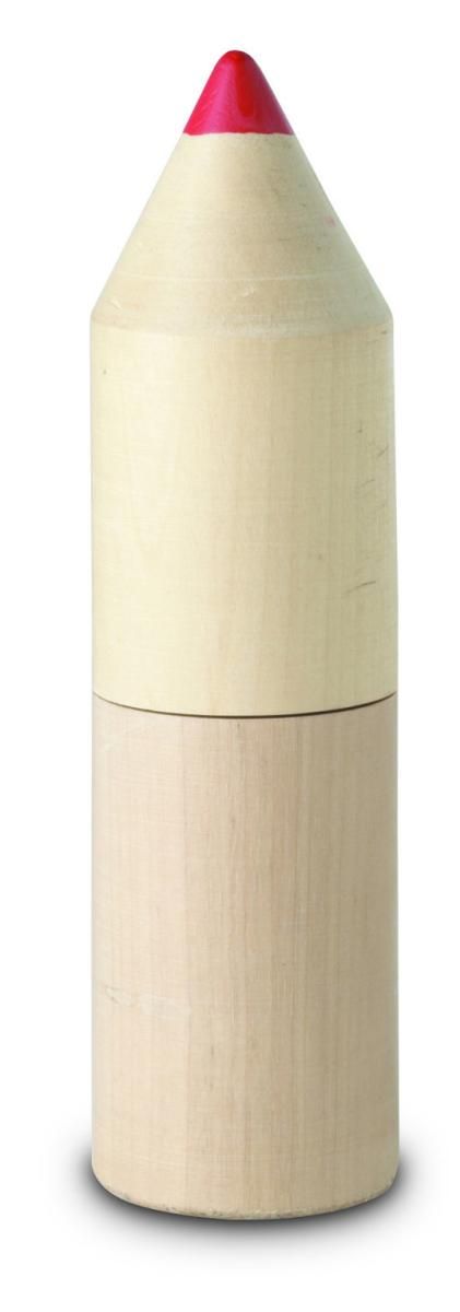 12 lápices de madera en caja de madera con forma de lápiz.