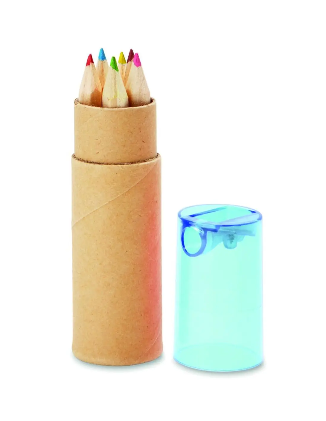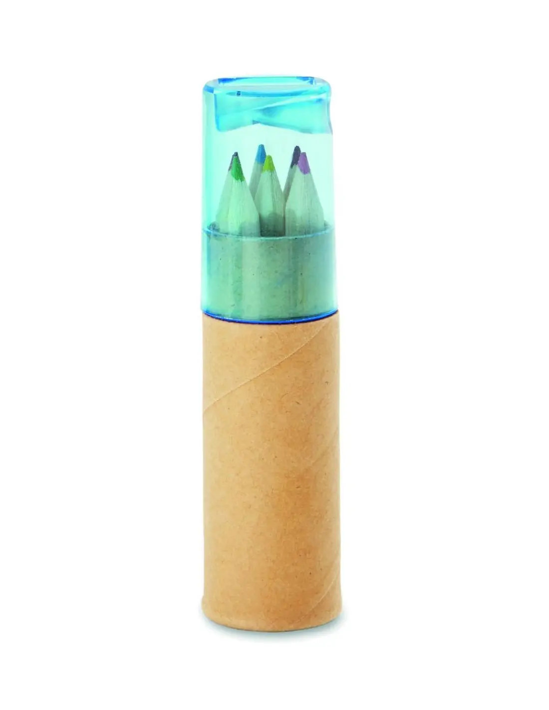 Lápices de colores de 6 piezas en tubo de papel reciclado. Sacapuntas tapa transparente.