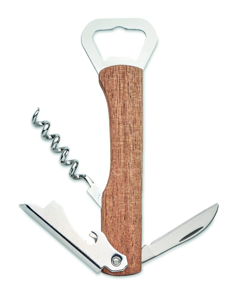 Abridor de botellas 3 en 1 en estuche de bambú. Incluye sacacorchos, 2 abridores de botellas y cortador de papel de aluminio.