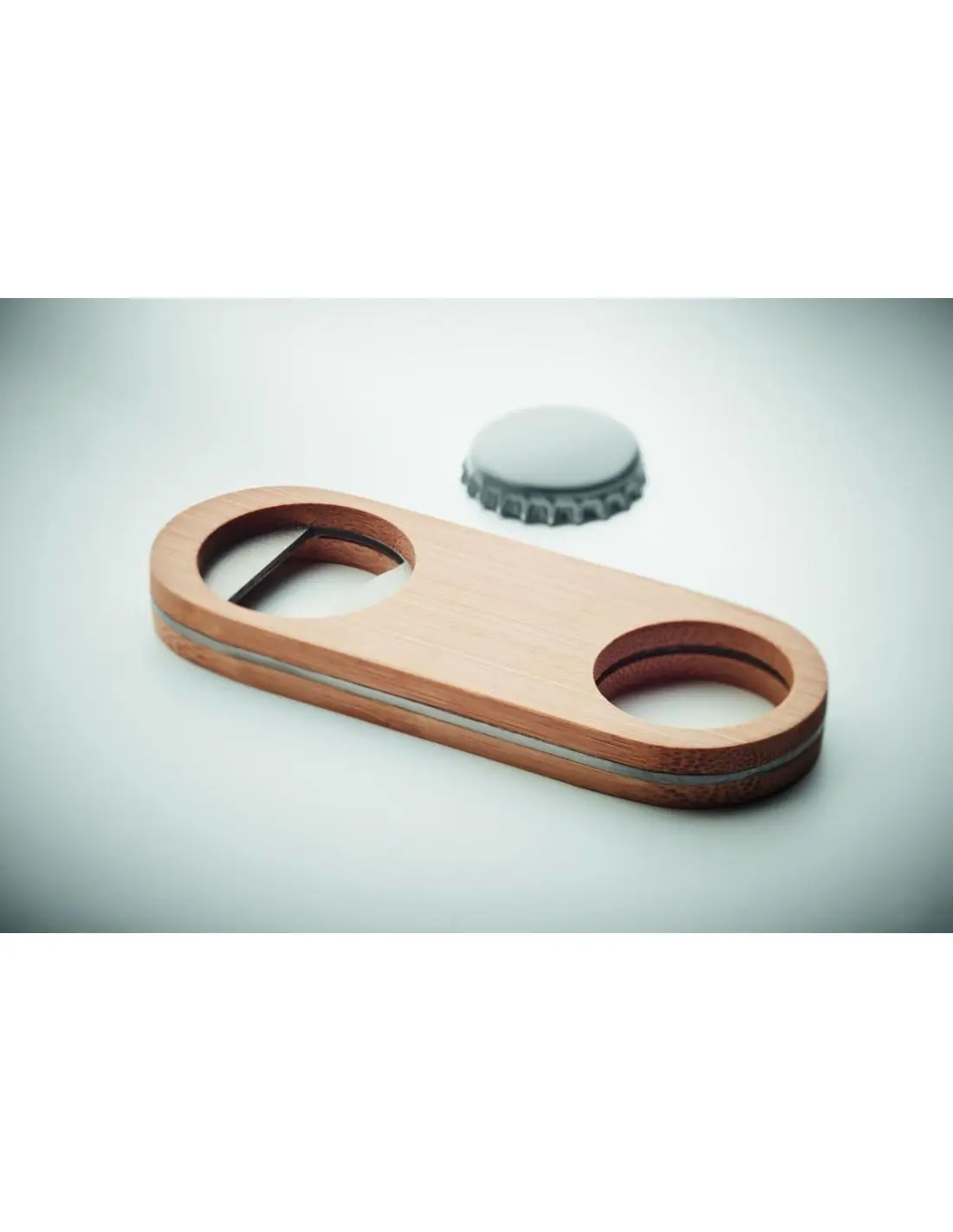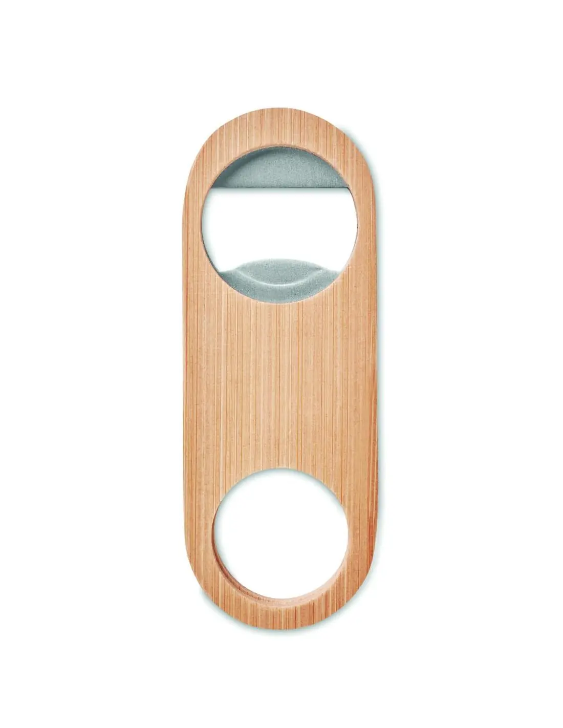 Abrebotellas de acero inoxidable con superficie de bambú. El bambú es un producto natural, puede haber ligeras variaciones en el color y el tamaño por artículo, lo que puede afectar el resultado final de la impresión. FSC®-certified | FSC 100%, N5.7, FSC-C213206