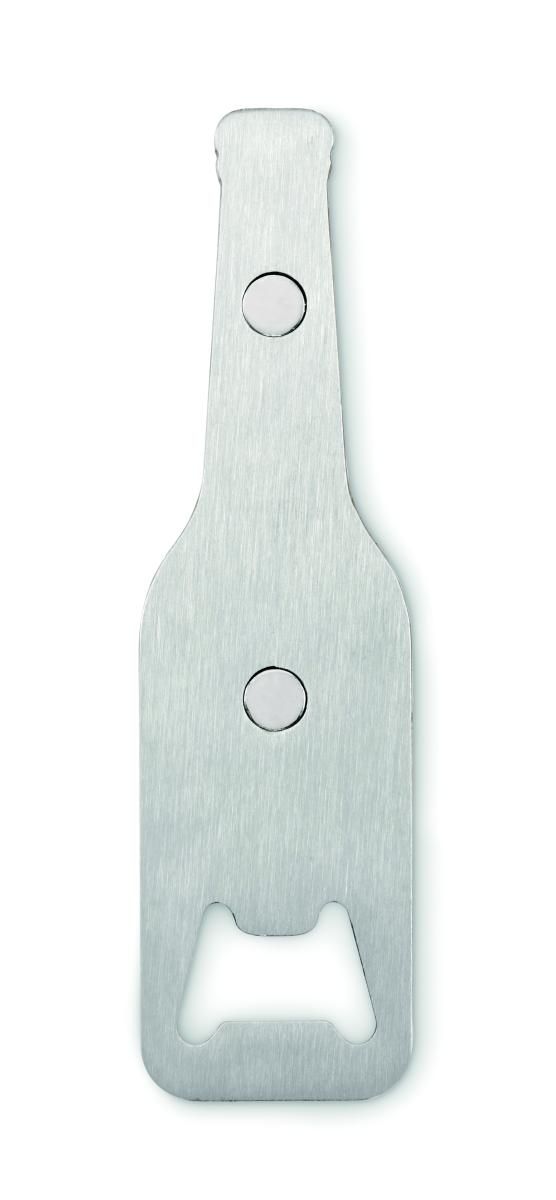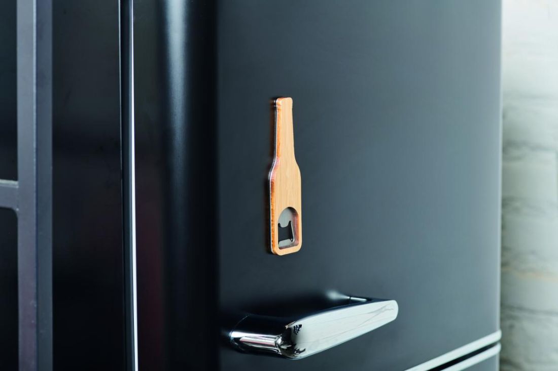 Abrebotellas magnético de acero inoxidable con superficie de bambú.