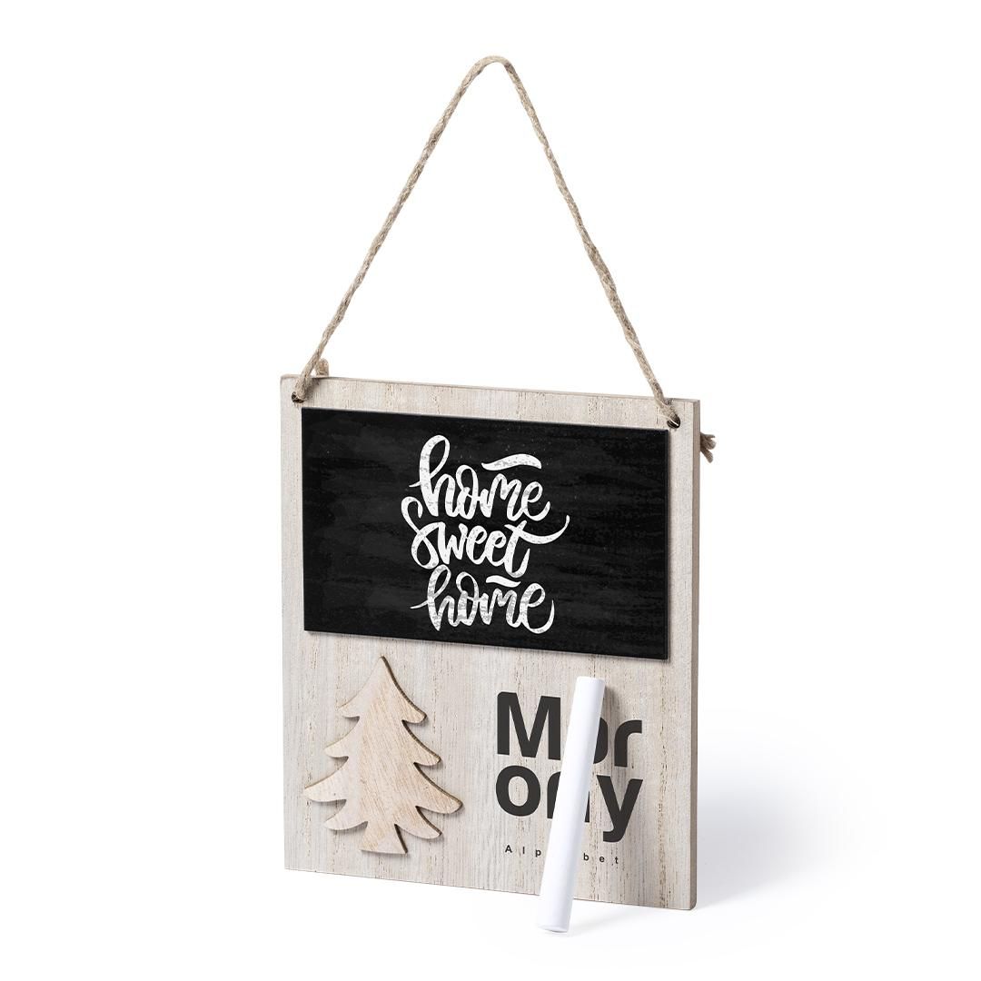 Adorno de navidad de línea nature, con pizarra y original diseño troquelado de árbol de navidad, fabricado en madera de tacto suave. Parte trasera imantada y cordón para colgar en yute. Incluye tiza para escribir. Presentada en bolsa individual.