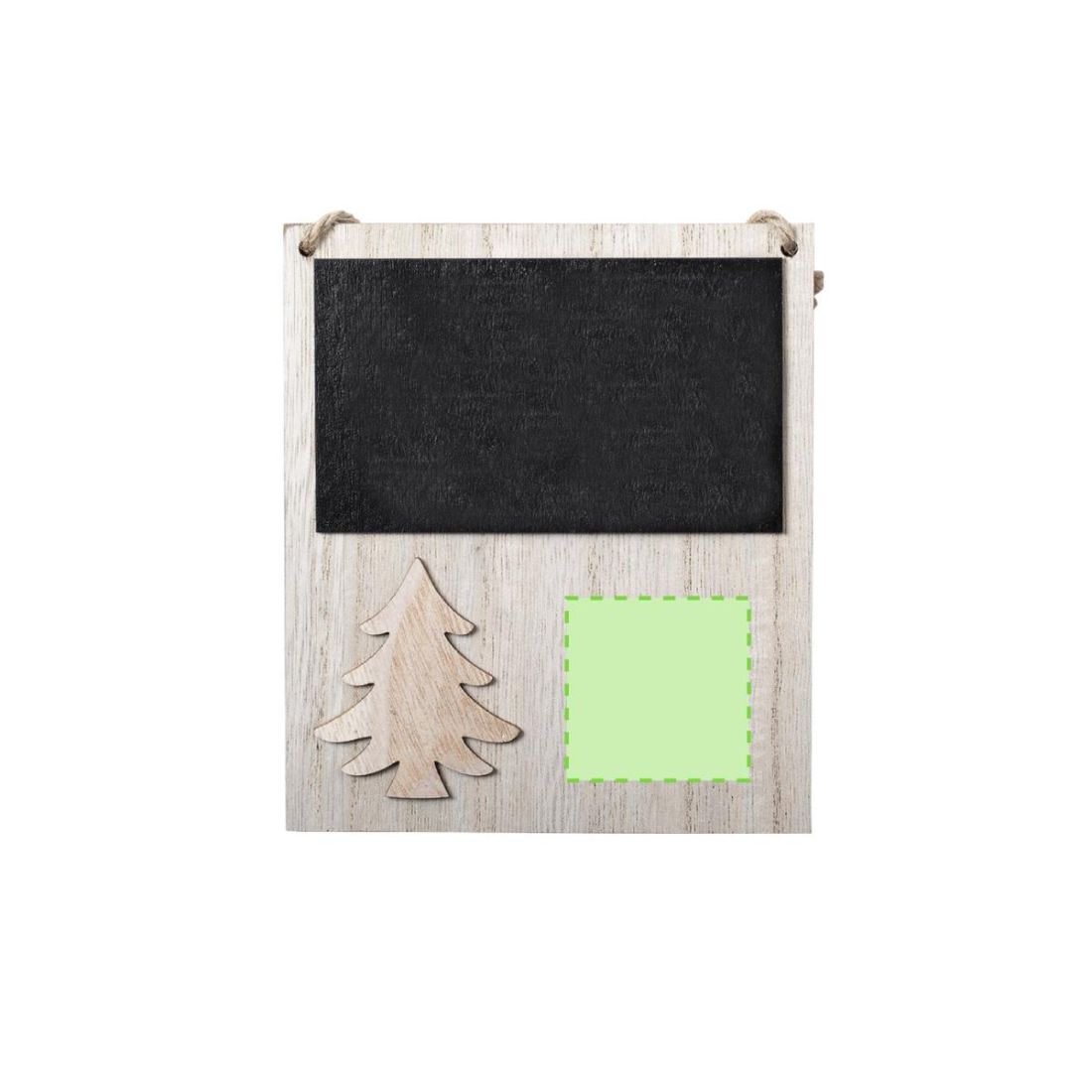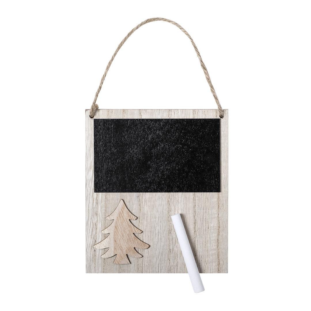 Adorno de navidad de línea nature, con pizarra y original diseño troquelado de árbol de navidad, fabricado en madera de tacto suave. Parte trasera...