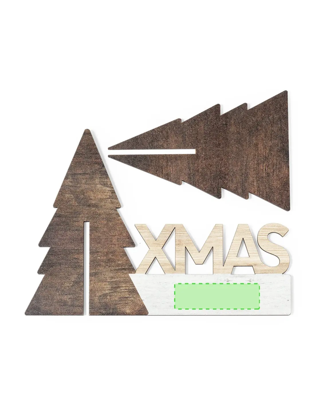 Adorno navideño con diseño árbol de navidad, fabricado en madera natural, con texto XMAS troquelado y de original acabado bicolor. Amplia superficie de marcaje, fácil montaje y distintivo Made In Europe.