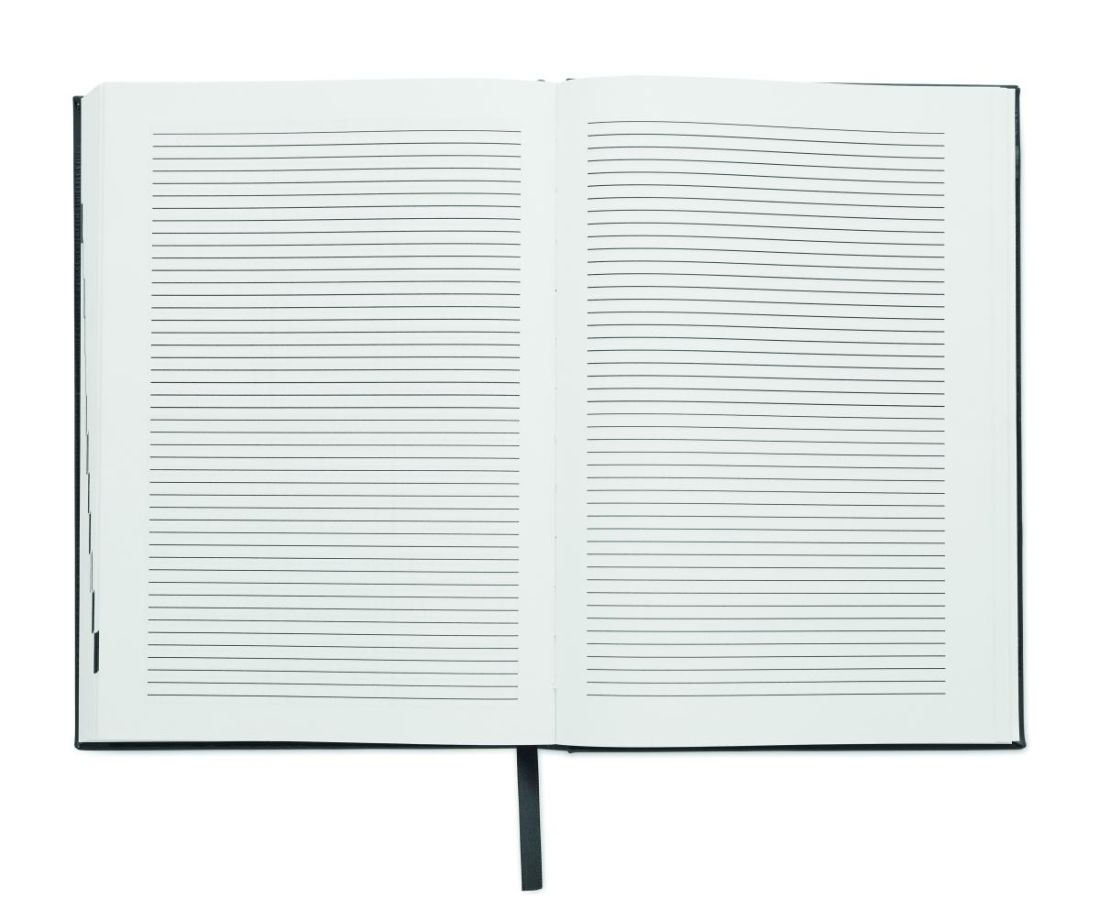 Libreta A5 con agenda perpetuo dia pagina en poliéster postconsumo reciclado 60% y tapa PU 40%. 416 páginas universales en papel reciclado de 70 g/m² (208 hojas). Con marcapáginas de cinta de poliéster del mismo color.
