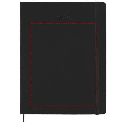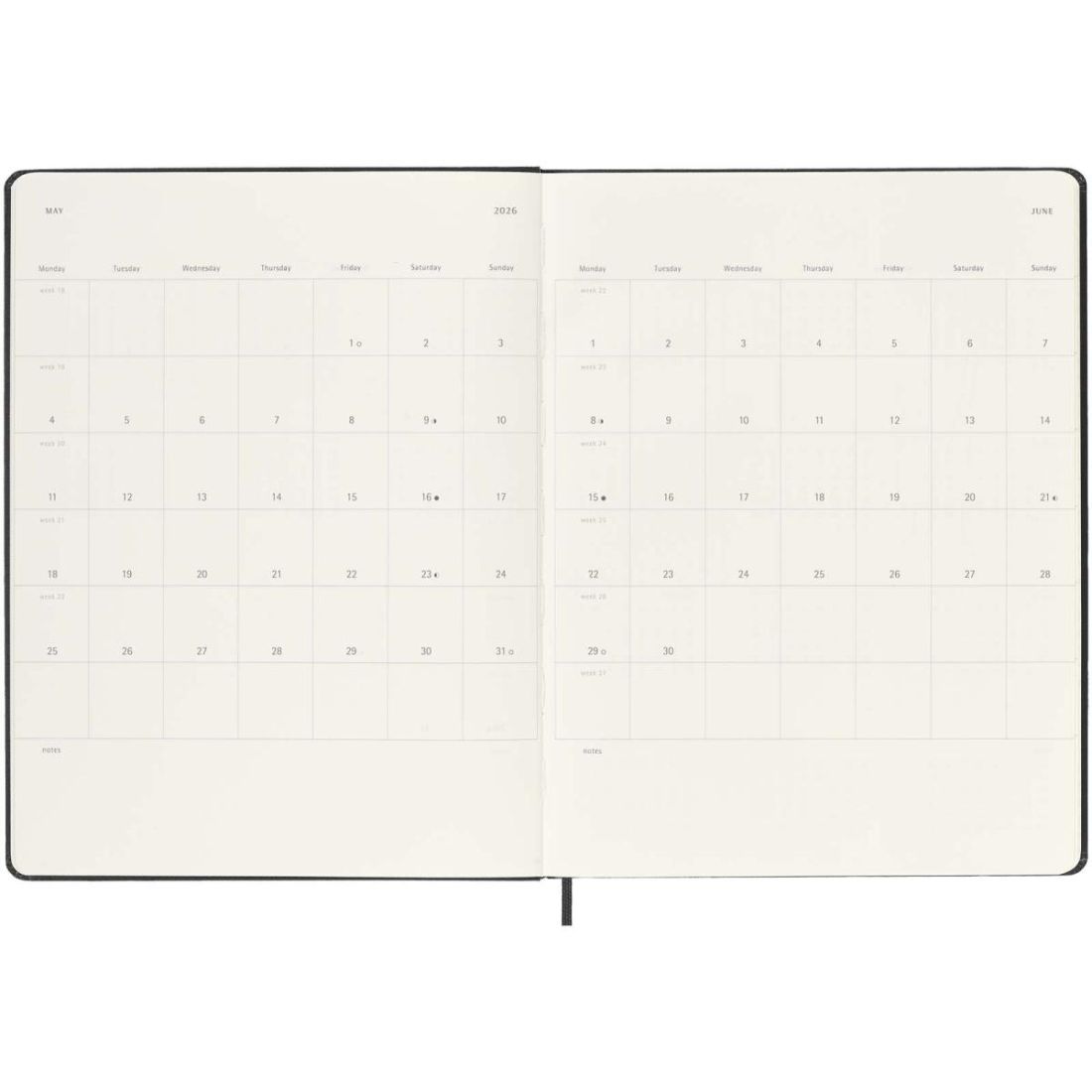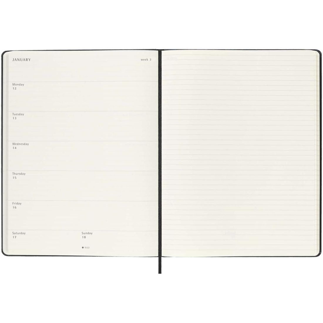 Fechada de enero a diciembre de 2026, la agenda semanal para 12 meses de tapa dura y tamaño XL muestra toda la semana de un vistazo, al tiempo que ofrece páginas con vista anual y mensual para una visión más amplia del año, seguidas de páginas para planificar viajes, ideas y objetivos. Los días de cada semana se muestran en una cara, mientras que la opuesta es una página rayada para tareas y notas. Incluye papel color marfil libre de ácidos, un cierre elástico negro, un marcapáginas de cinta, un bolsillo interior extensible de color a conjunto y adhesivos para la personalización, así como adhesivos del año para el lomo.