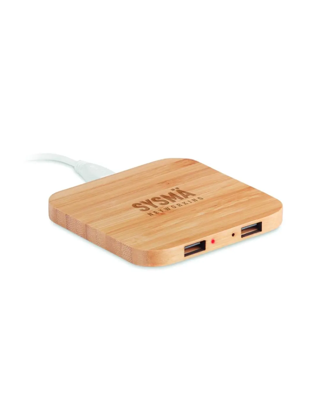 Base de carga inalámbrica de bambú con 2 puertos USB 2.0.Output: DC5V/1A (5W).El bambú es un material natural, el color del artículo, la medida y la impresión sobre él puede variar.