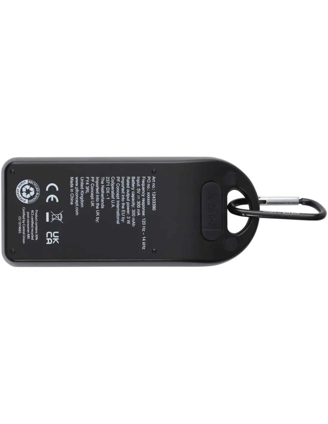 Altavoz Bluetooth® de plástico reciclado con certificación RCS de 3 W para reproducir música, pódcasts u otros contenidos desde cualquier dispositivo con Bluetooth®, por lo que resulta el compañero ideal para cualquier ocasión. Gracias a su mosquetón, el altavoz se puede sujetar fácilmente a una mochila, y la clasificación IPX4 lo protege contra la lluvia ocasional. Disfruta de hasta 1,5 horas de música a máximo volumen gracias a su batería de iones de litio de 300 mAh. El tiempo de carga es de 1,5 horas. Bluetooth® 5.0 con un rango de alcance de aproximadamente 10 metros. Se entrega con un manual de usuario, un mosquetón y un cable de carga USB de tipo A-C de 50 cm, y empaquetado en una caja de papel kraft 100 % reciclado.