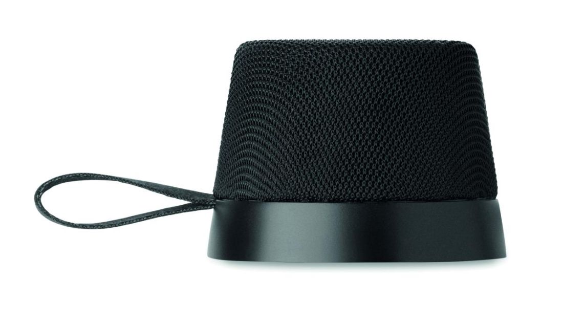 Altavoz inalámbrico 4.2 con carcasa de ABS, tejido de poliéster RPET y asa. El imán de la parte trasera permite utilizarlo como soporte. Batería recargable Li-ION de 300 mAh incluida. Datos de salida: 3 W, 4 ohm y 5 V. Tiempo de reproducción aprox. 2 horas