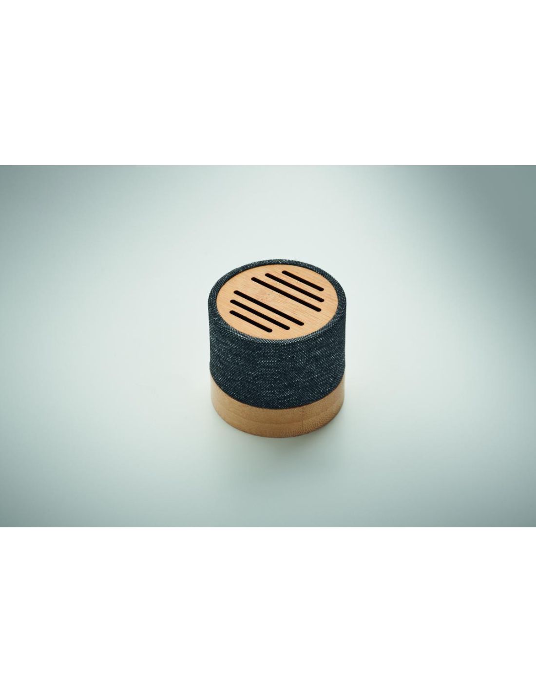 Altavoz inalámbrico 5.0 con carcasa de RPET y bambú en parte superior. Indicador LED. Batería recargable de Li-ION de 300 mAh. Ranura tarjetas SD y cable AUX/ USB. Función manos libres. Output: 3W, 3 Ohm y 5V. Tiempo de repro. aprox. 3h. El bambú es material natural, el color del articulo puede variar.