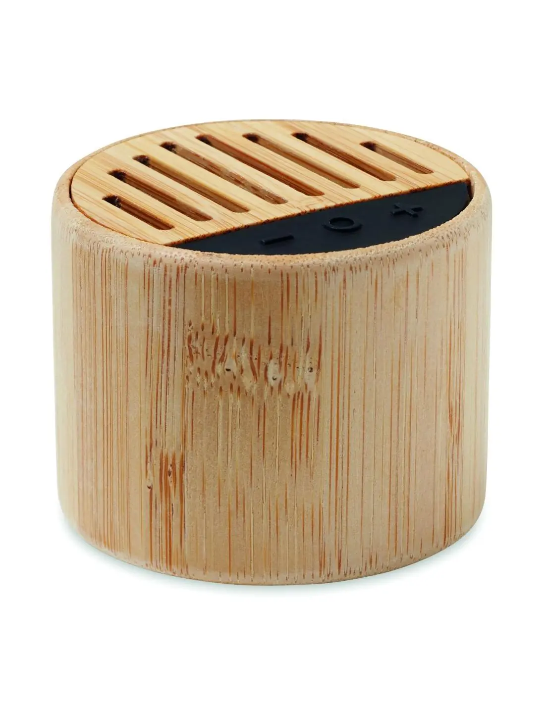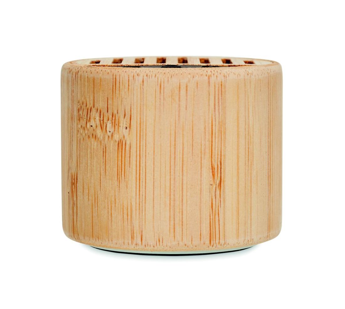 Altavoz inalámbrico 5.3 en ABS con carcasa de bambú y luz indicadora LED. Batería de litio recargable de 300 mAh incluida. Output: 3W, 4 Ohm y 5V. Tiempo de reproducción aprox. 4 horas. El bambú es material natural, el color del articulo puede variar.