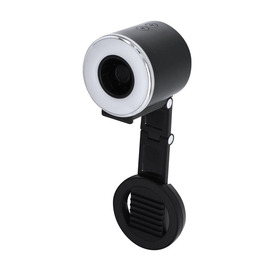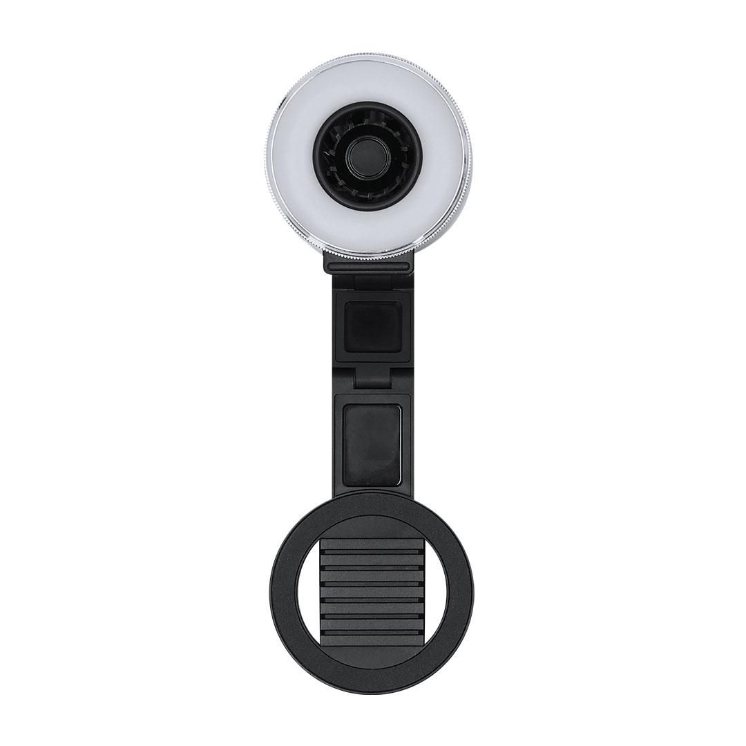 Anillo de luz con ventilador fabricado en resistente ABS con acabado mate. Incluye soporte magnético multiposición extensible para smartphone. Ventilador con 3 velocidades con opción a cambio a través de botón. El anillo de luz cuenta con 16 LEDs con opción a 3 niveles de intensidad de luz. Incluye botón de encendido y apagado, control de luz y velocidad. Batería de 500mAh recargable por cable de carga tipo C incluido, 5V.