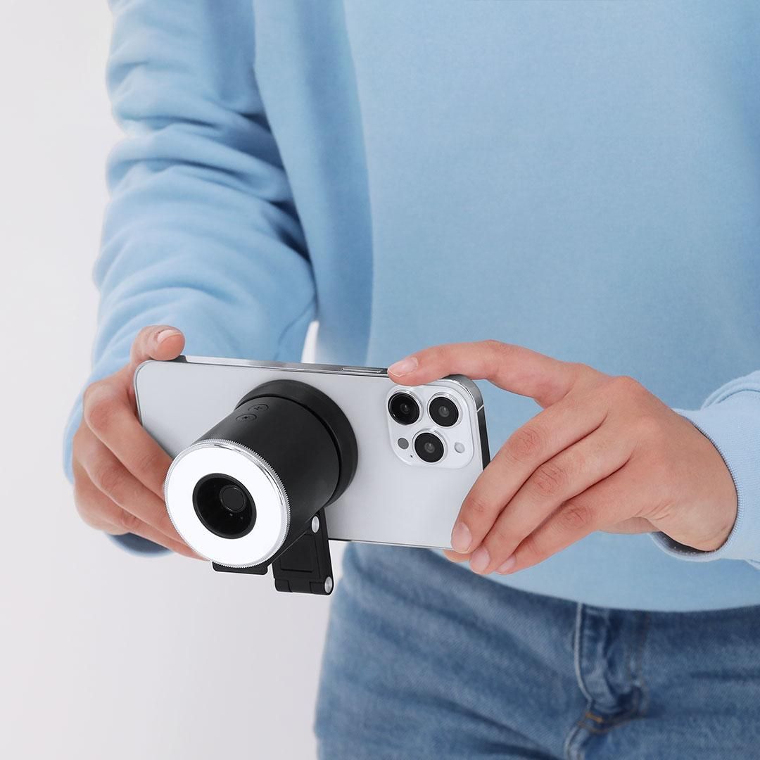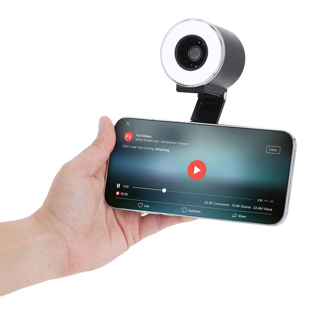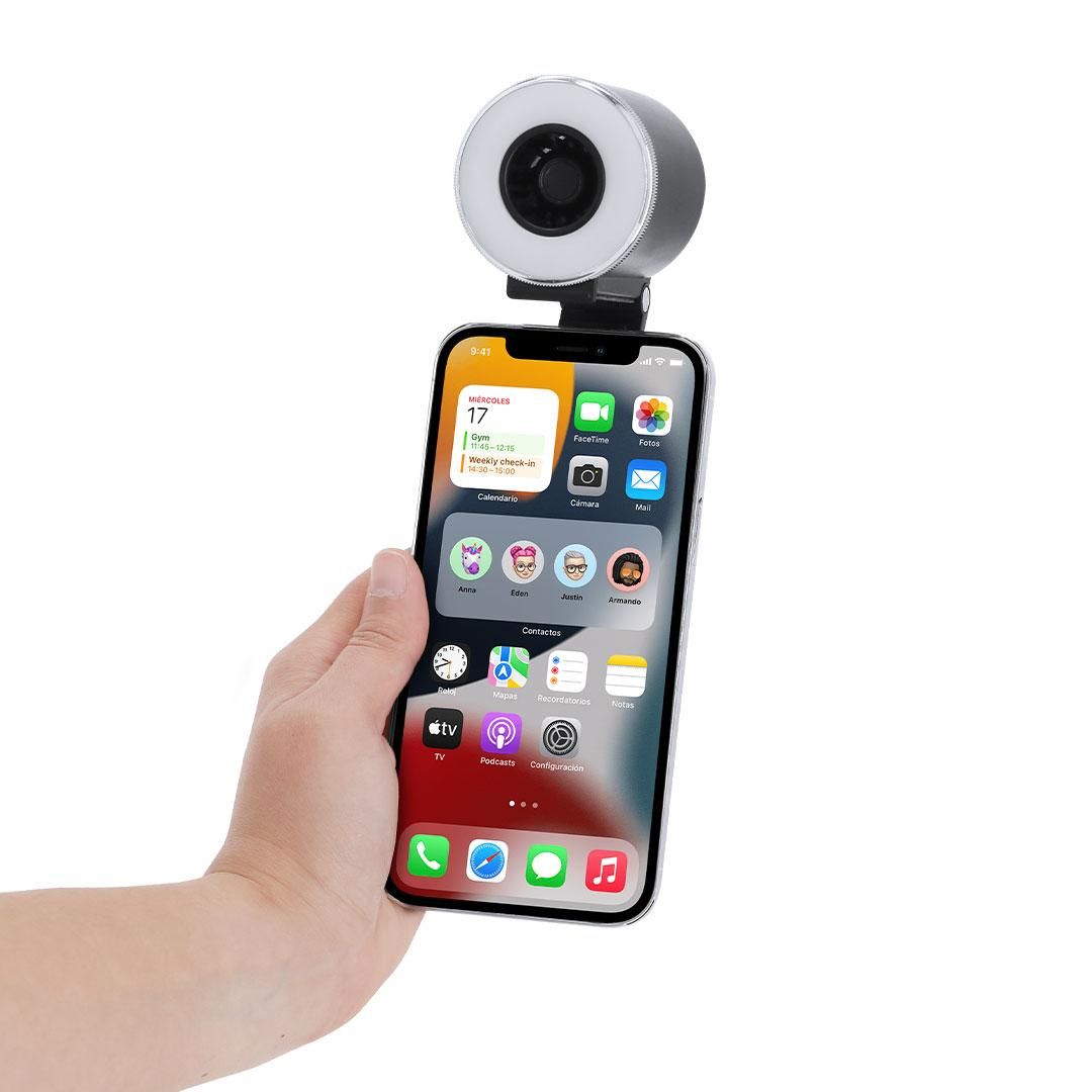 Anillo de luz con ventilador fabricado en resistente ABS con acabado mate. Incluye soporte magnético multiposición extensible para smartphone....