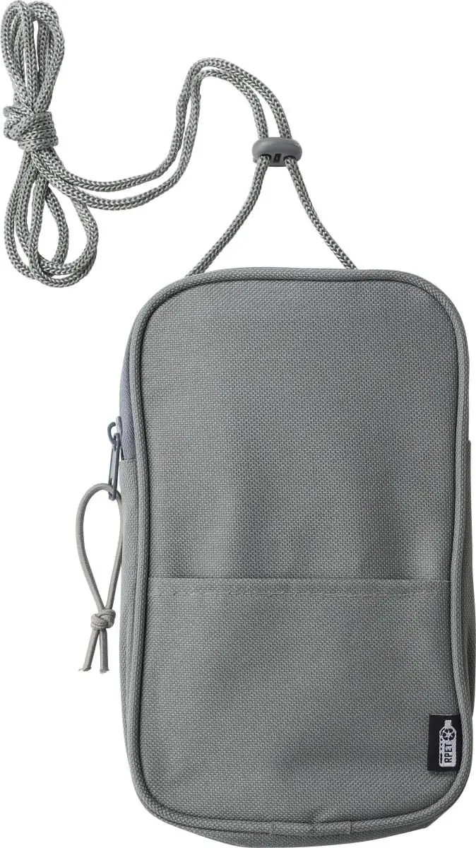 Bolsita bandolera de poliéster rPET (600D) para llevar colgada al cuello, al hombro o bien ajustada a la muñeca mediante un cordón. Tiene un compartimento grande con cremallera y banda elástica y un bolsillo insertado. Con etiqueta rPET.