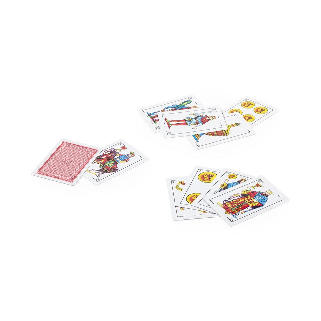 Baraja española fabricada en resistente papel laminado. Incluye 50 naipes, presentados en estuche individual de acabado translúcido y con cierre de seguridad.