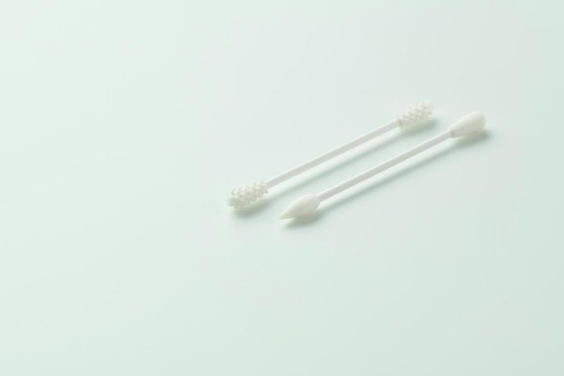 Set de 2 bastoncillos de silicona reutilizables y lavables con 3 cabezales diferentes. Presentados en bolsa de algodón con cordón.