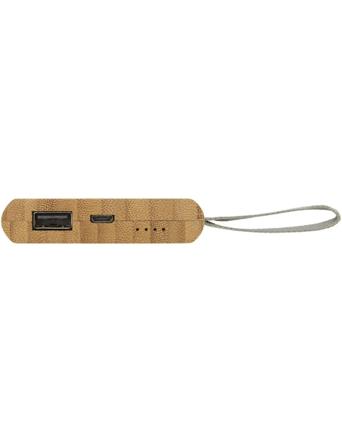 Batería externa de bambú que proporciona 5000 mAh de carga adicional para teléfonos móviles u otros dispositivos digitales. Cuenta con luces indicadoras LED y una correa hecha de PET reciclado. Incluye un cable de carga micro USB. Se suministra en una caja de regalo fabricada con material 100 % con certificado FSC e incluye un manual sobre FSC. Dado que el bambú es un producto natural, puede haber ligeras variaciones de color y tamaño en los artículos, lo que puede afectar al resultado final de la grabación.