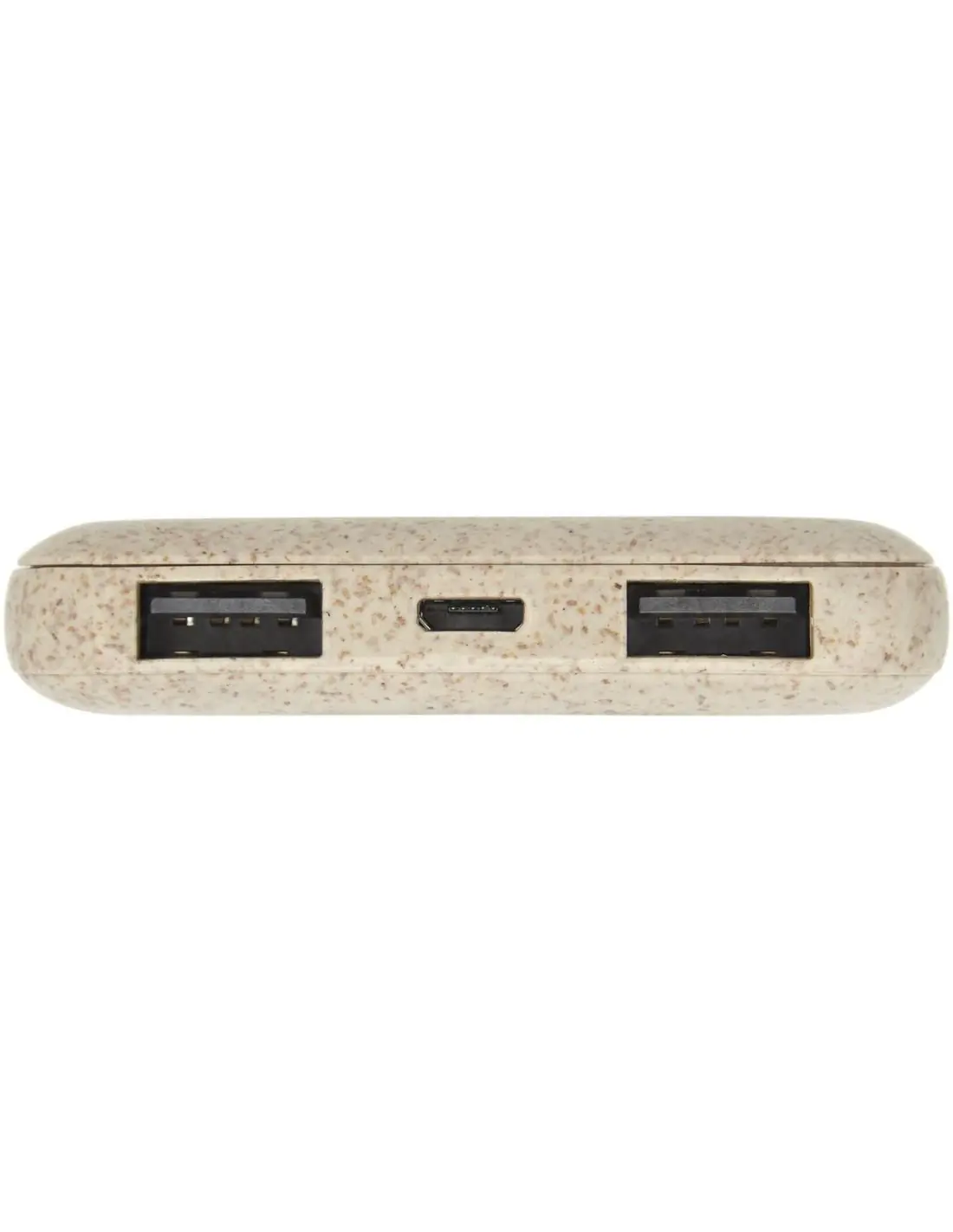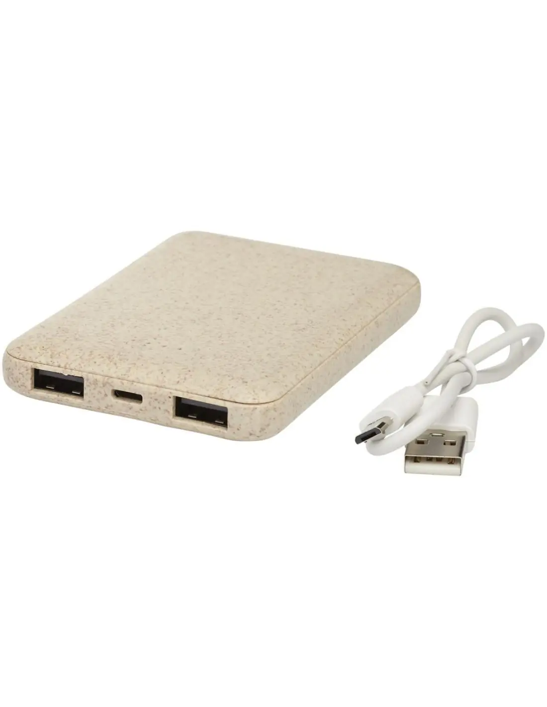Batería externa de 5000 mAh, ligera y compacta, fabricada con paja de trigo y material plástico mezclados, a fin de reducir la cantidad de plástico necesario. Salida USB doble que permite cargar 2 dispositivos al mismo tiempo. Empaquetada en una caja de regalo 100 % con certificación FSC y con un manual impreso FSC. Incluye un cable de carga micro USB.