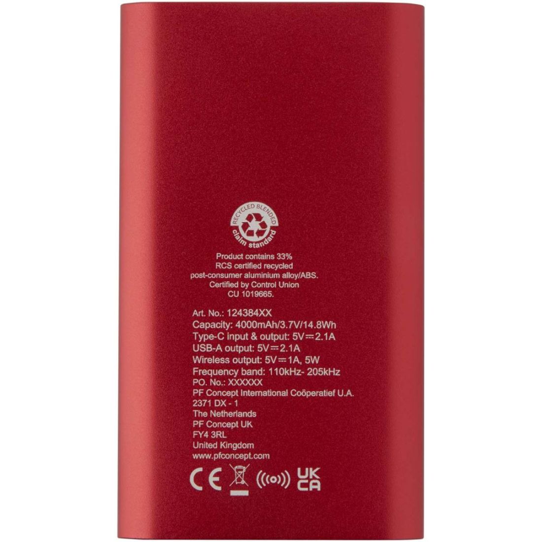Batería externa con puerto de entrada/salida tipo C y un puerto USB A, por lo que permite cargar 2 dispositivos simultáneamente. También admite carga inalámbrica de 5 W para todos los dispositivos compatibles con Qi. La batería externa es de polímero de litio de 4000 mAh y proporciona una potencia de salida total máxima de 10 W. Esta batería externa está fabricada con un 28 % de plástico reciclado con certificación RCS. Se entrega con un cable de carga de TPE tipo C a USB A.