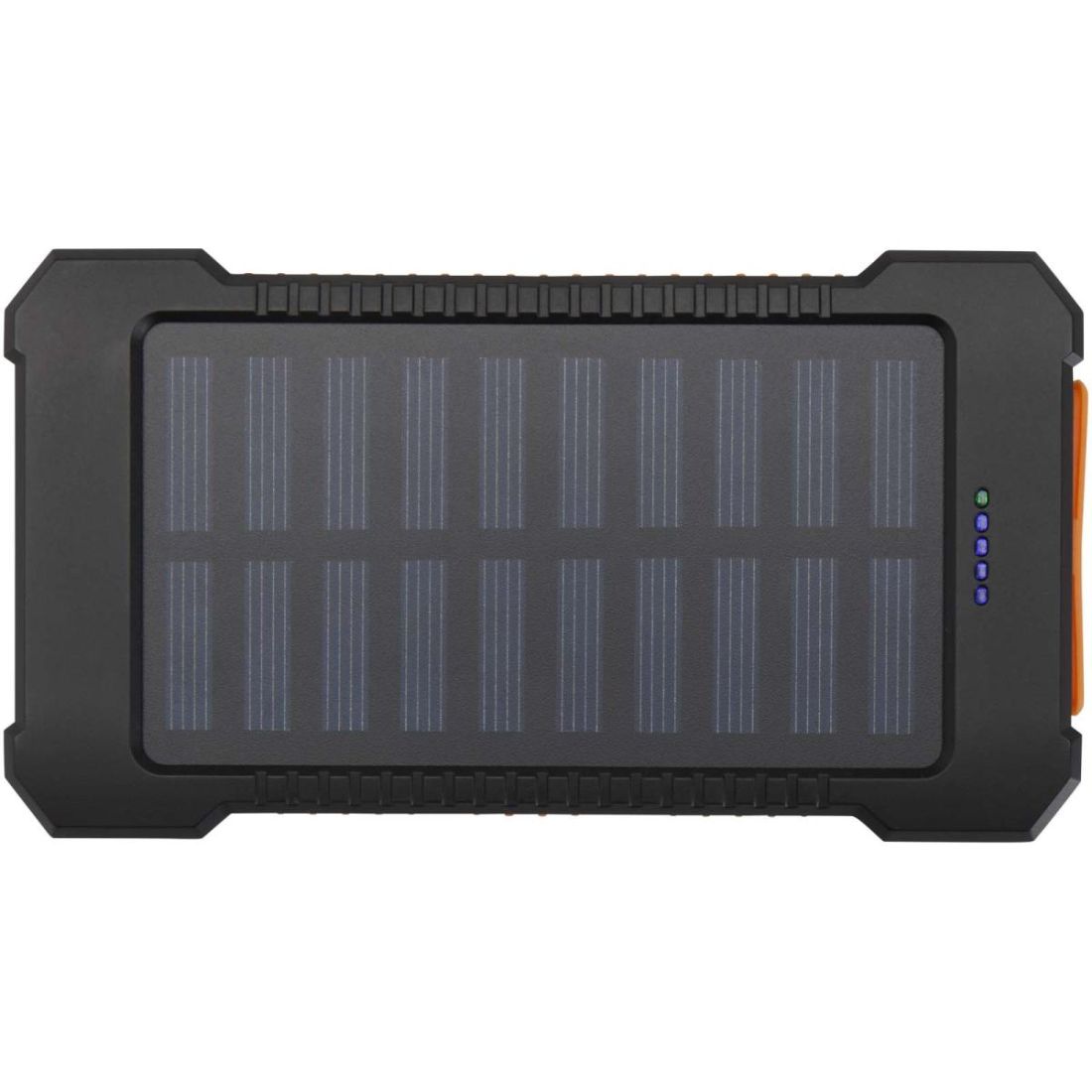 La batería externa solar de 5000 mAh, fabricada con plástico reciclado, es duradera y práctica. Ofrece dos puertos de salida USB-A y un puerto de entrada/salida tipo C para tener opciones de carga flexibles. Diseñada con un exterior resistente, cuenta con un clip extraíble para facilitar su sujeción, una linterna integrada y conectores que se guardan de forma segura detrás de una tapa de silicona. Con capacidad de carga solar y un indicador LED para mostrar el estado de carga, esta batería externa es ideal para las aventuras al aire libre.