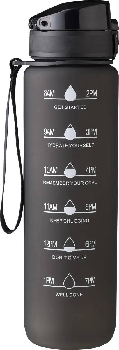 Botella de rPET (1 litro) con acabado mate, tapa antigoteo y cinta para la muñeca. Tiene impresa la capacidad en un lado y las horas como recordato…