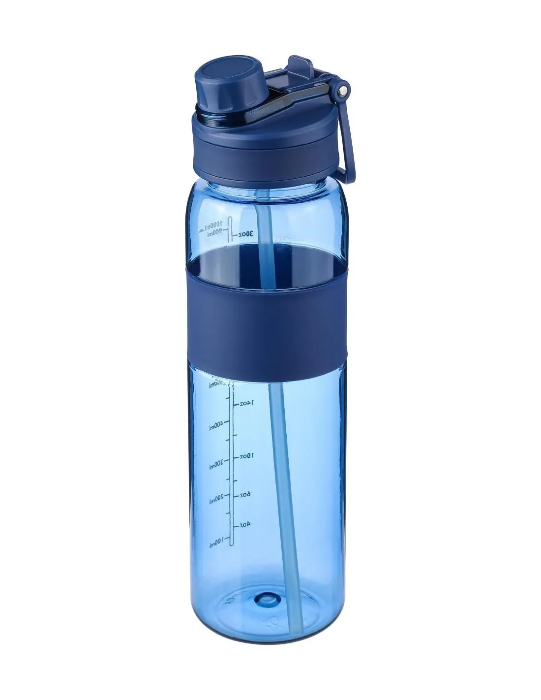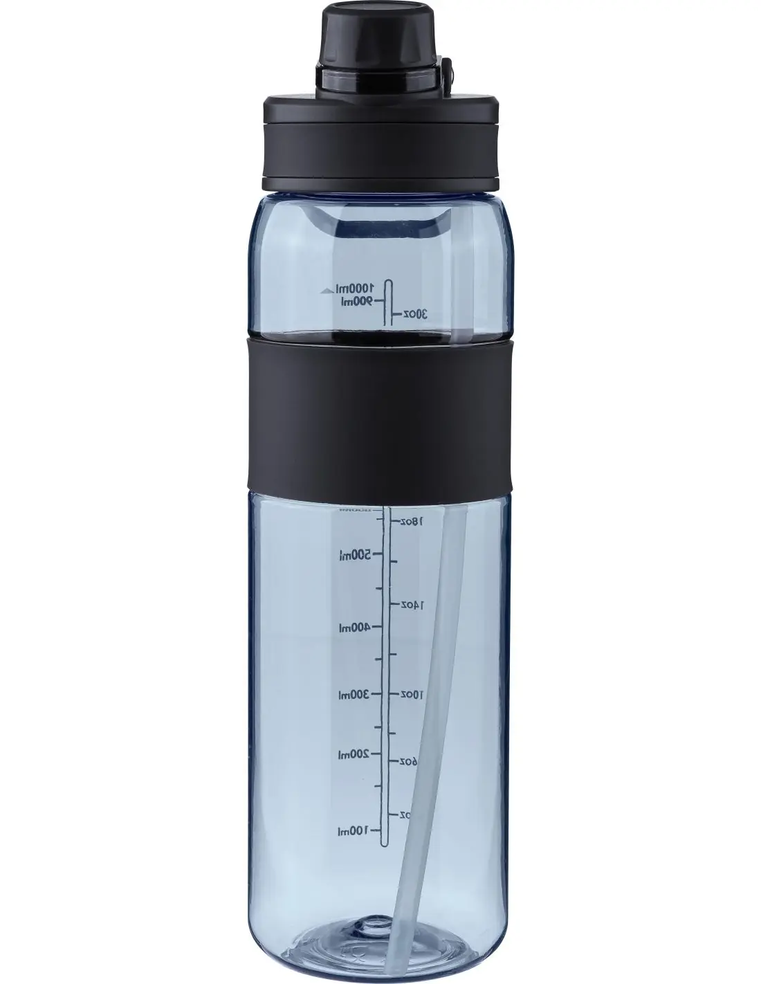 Bidón de Tritan (900 ml) con dos opciones de bebida: cierre giratorio y pajita plegable con tubo interior. Cuenta con tapón de rosca, agarre de sil…