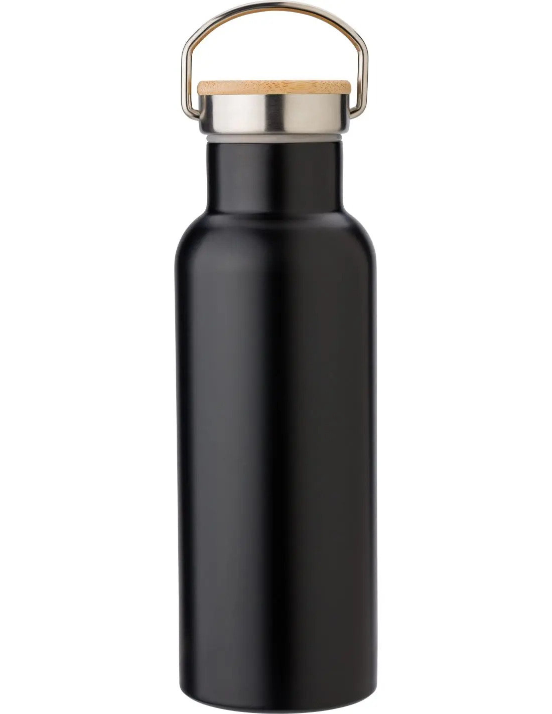 Botella termo con doble pared de acero inoxidable 304 (500 ml), con tapón de rosca con aplicación de bambú y asa. A temperatura ambiente, mantiene el líquido 3-4 h. frío/caliente (aprox.). Evitar bebidas ácidas o con gas.