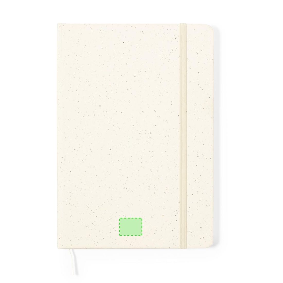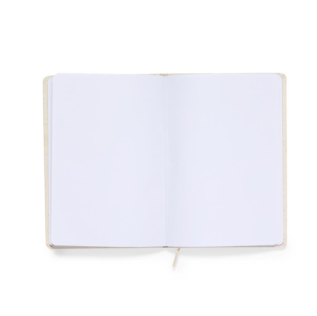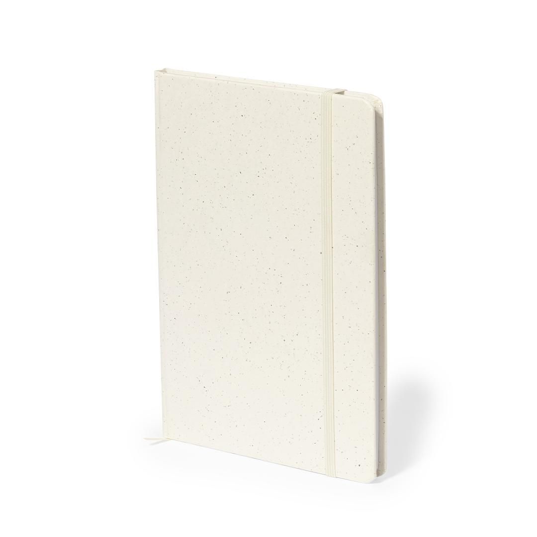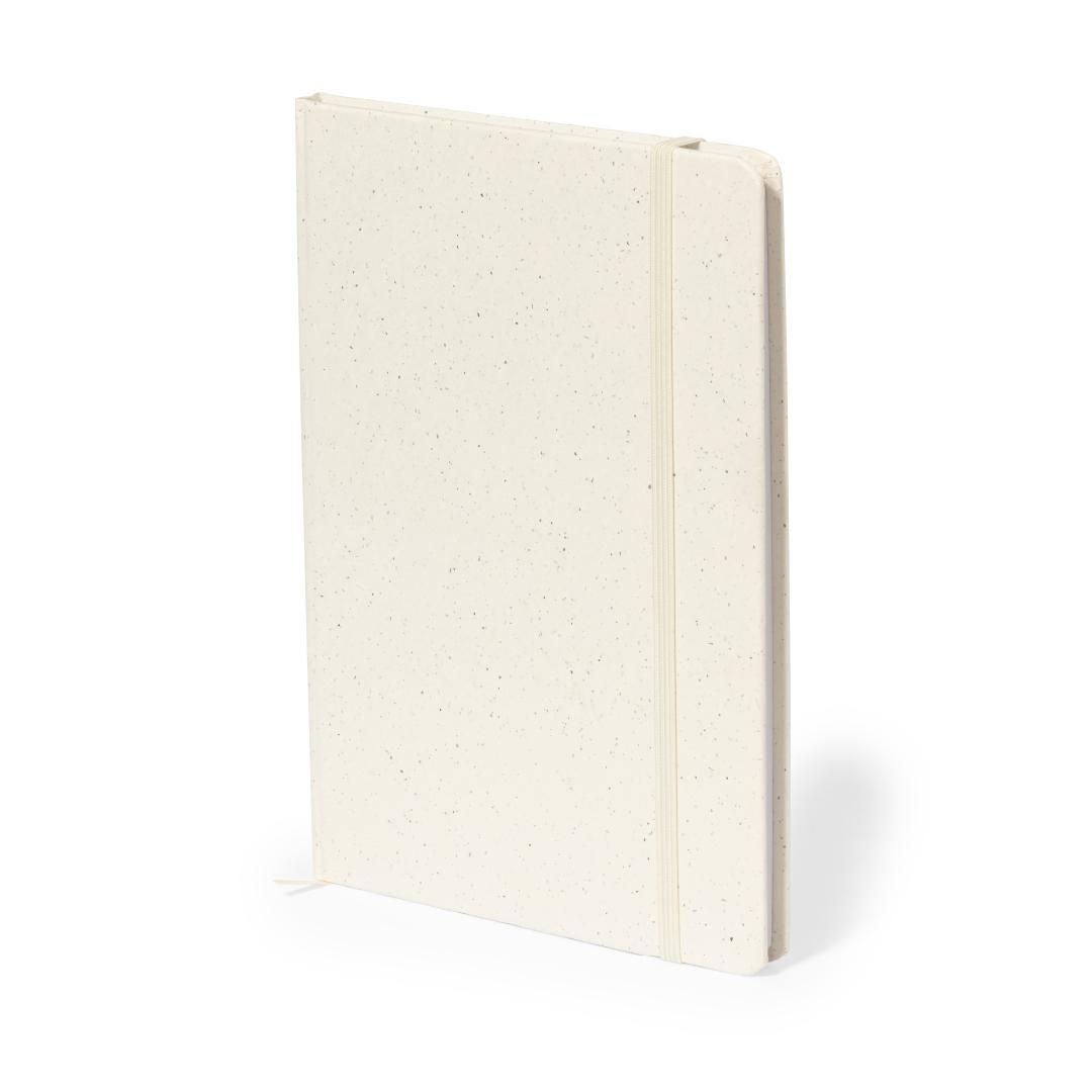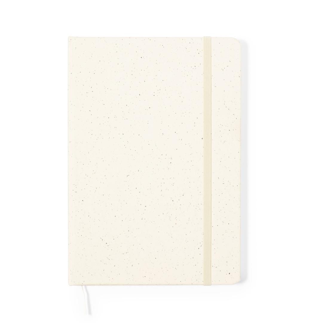 Bloc de notas A5 con tapas duras en resistente cartón reciclado. De 100 hojas blancas lisas y banda elástica para su cierre. Presentado en bolsa individual reciclada.