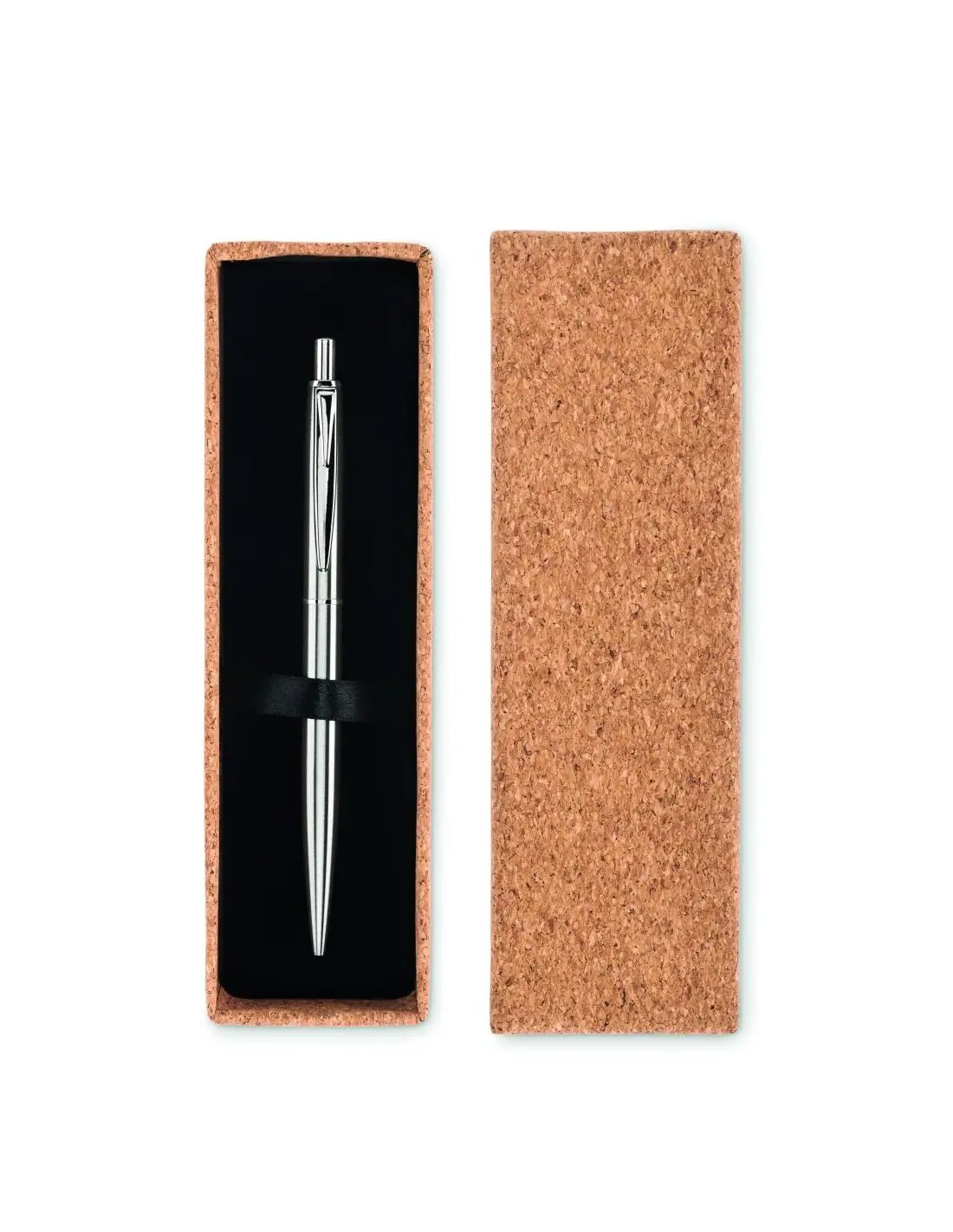 Bolígrafo con pulsador y cuerpo de acero inoxidable reciclado. Presentado en caja de corcho a juego. Tinta azul. El corcho es un material natural, debido a su naturaleza estructural y porosidad superficial, el resultado final de la impresión por artículo puede tener desviaciones.