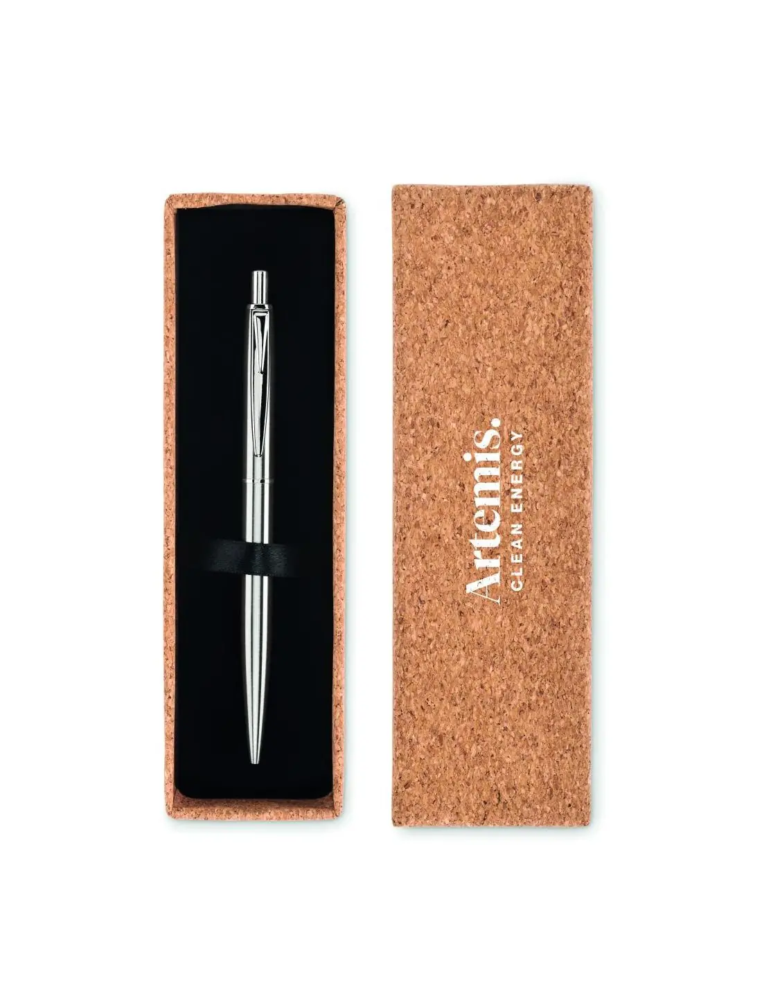 Bolígrafo con pulsador y cuerpo de acero inoxidable reciclado. Presentado en caja de corcho a juego. Tinta azul. El corcho es un material natural, …