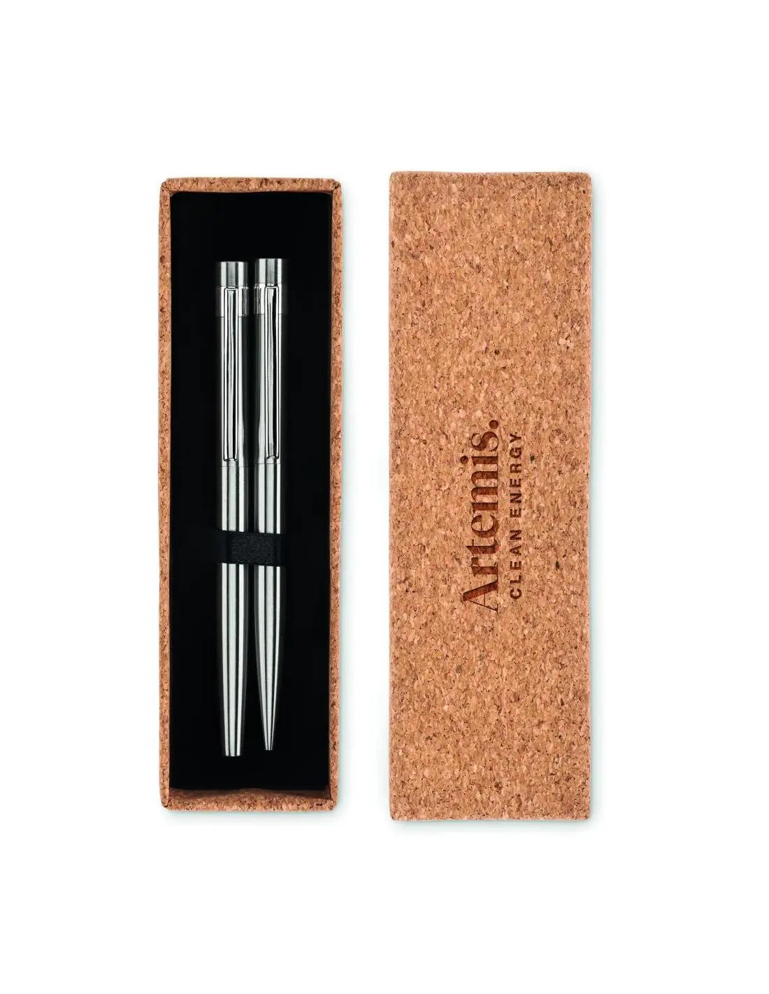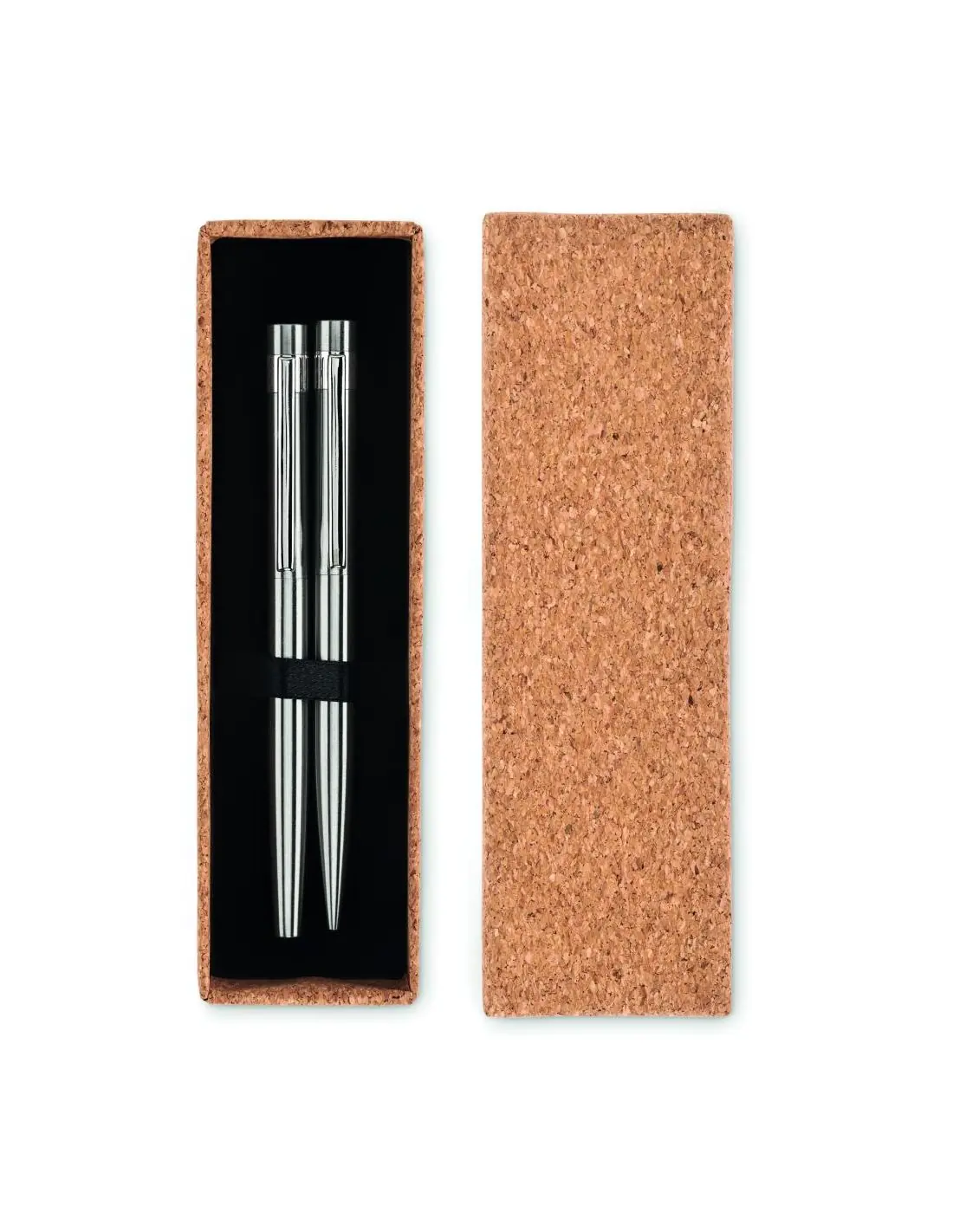 Set de bolígrafo y roller de acero inoxidable reciclado. Presentado en caja de corcho a juego. Tinta azul y negra respectivamente. El corcho es un material natural, debido a su naturaleza estructural y porosidad superficial, el resultado final de la impresión por artículo puede tener desviaciones.