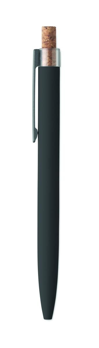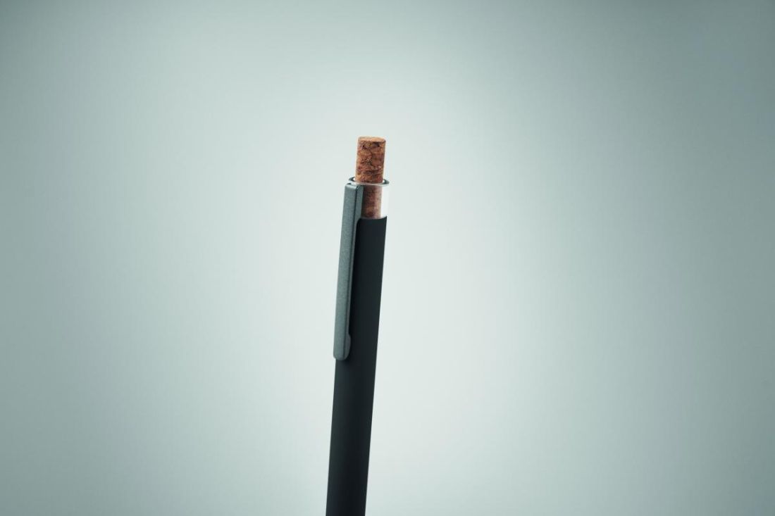 Bolígrafo de aluminio reciclado con pulsador de corcho y clip metálico. Tinta azul.
