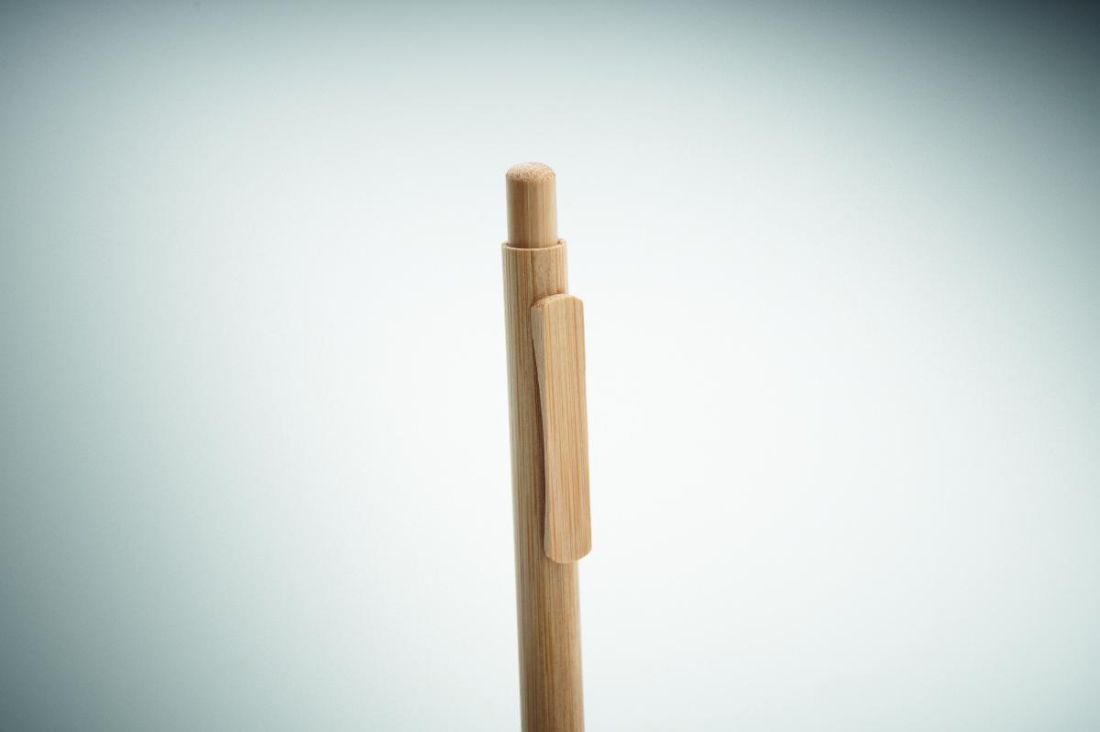 Bolígrafo de pulsador con cuerpo, punta, clip y cuerpo de bambú. Tinta azul.