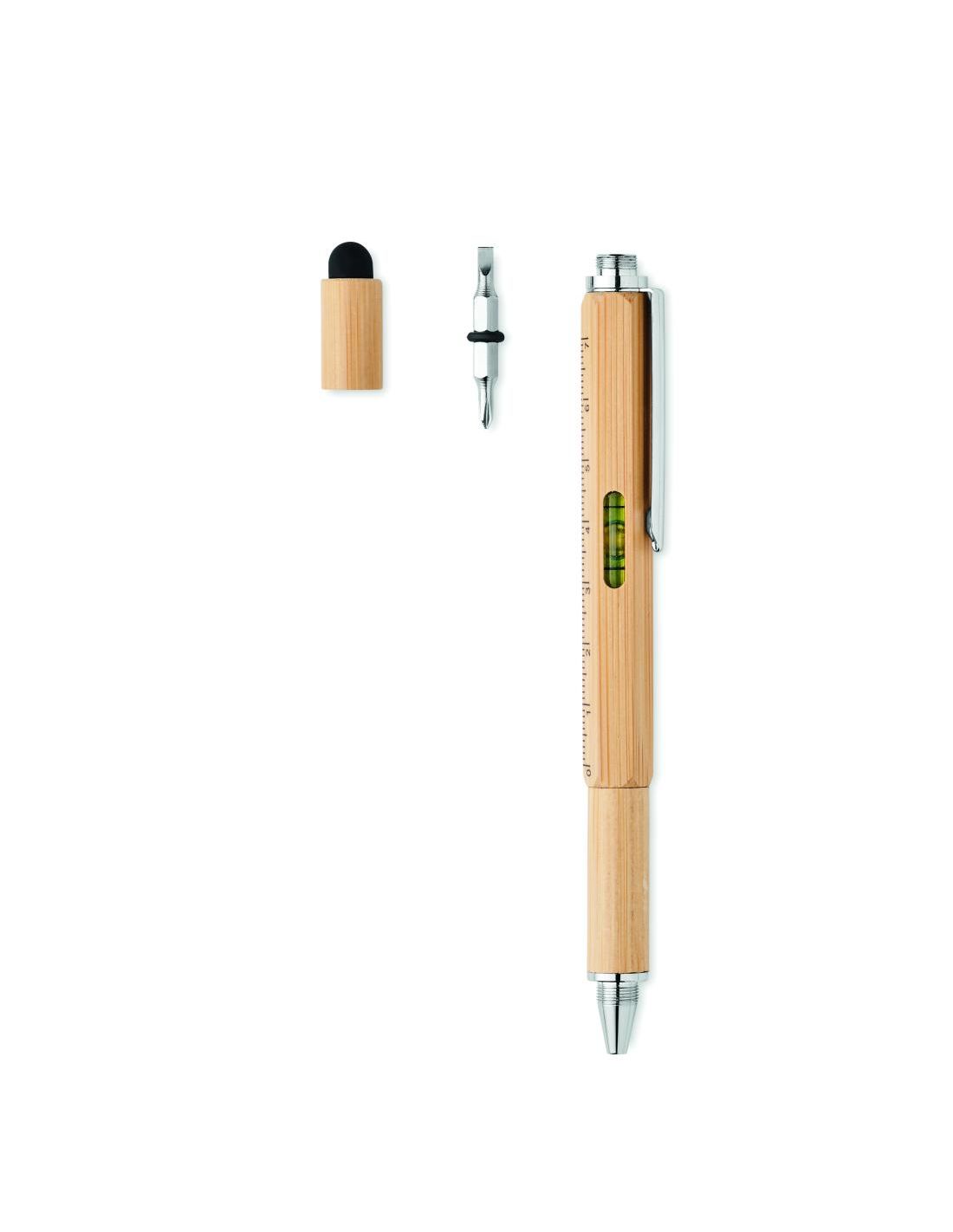 Bolígrafo giratorio de bambú con nivel de burbuja, regla de 7 cm, puntero táctil y puntas de destornillador de cabeza plana y Phillips. Tinta azul. El bambú es material natural, el color del articulo puede variar.