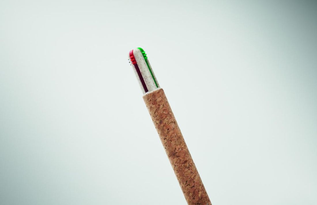 Bolígrafo de 4 colores con cuerpo de corcho y accesorios de paja de trigo (50%) y plástico ABS (50%). Tinta rojo, verde, azul y negro.