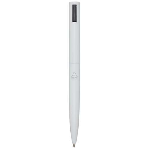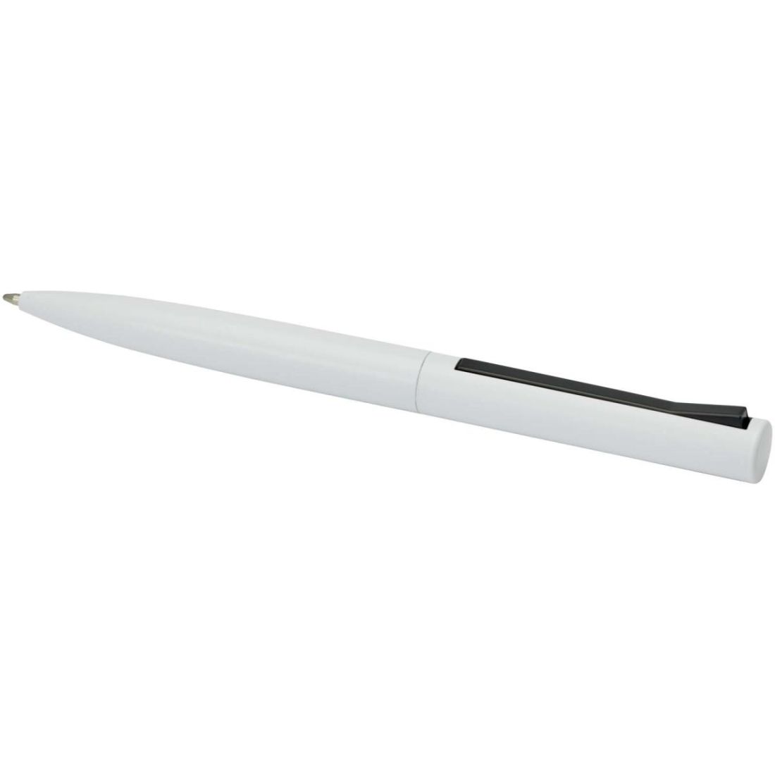 Bolígrafo con la parte superior del cuerpo de plástico reciclado y la parte inferior de aluminio reciclado. El bolígrafo cuenta con un clip de hierro basculante con resorte, lo que permite sujetarlo a objetos más gruesos, como bolsos o cuadernos. El clip se gira con un clic audible. Color de la tinta: Negro. Longitud de escritura: 1000 metros. Tamaño del plumín: 1,0 mm.