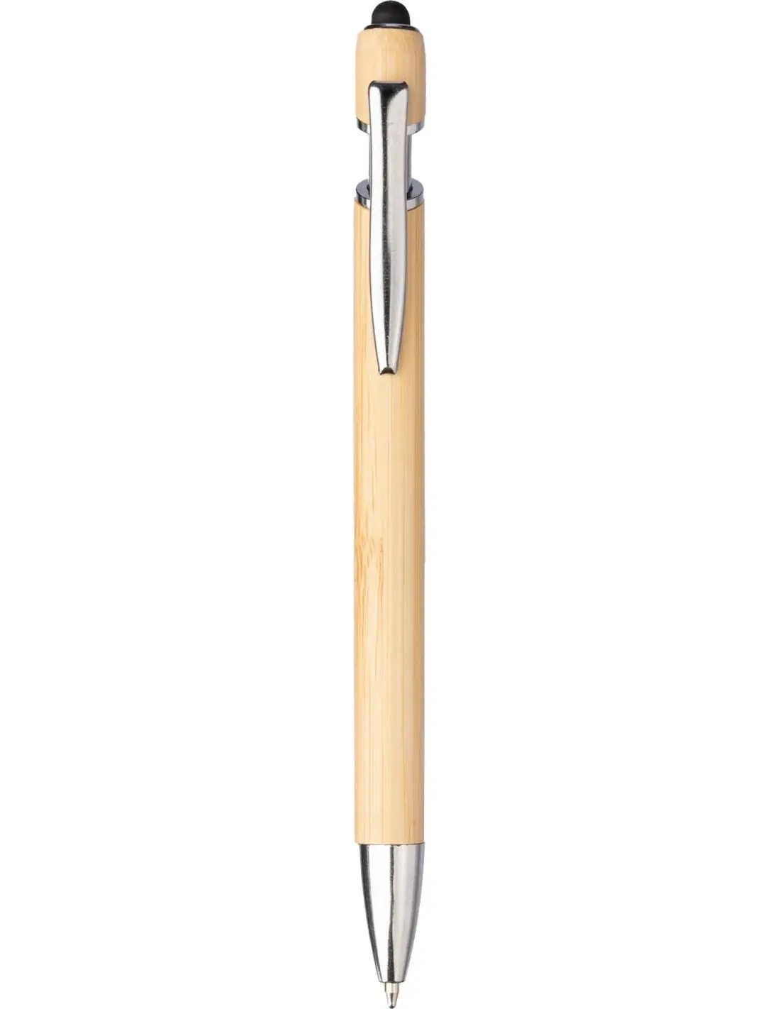 Bolígrafo de bambú con puntero táctil y clip metálico. Tinta azul.