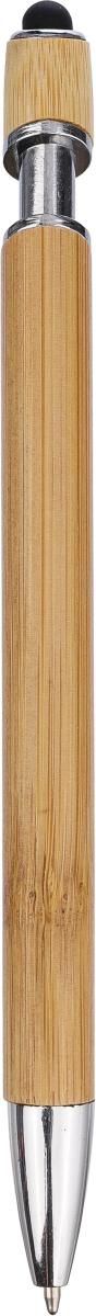 Bolígrafo de bambú con detalles en metal cromado y plástico cromado. Con puntero táctil en el pulsador. Aprox. 800 metros de longitud de escritura. Tinta azul.