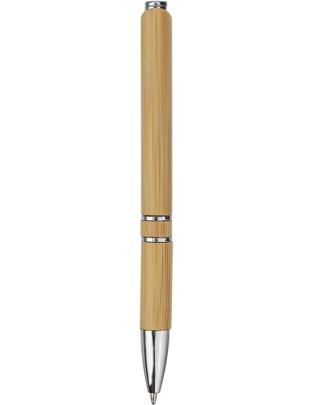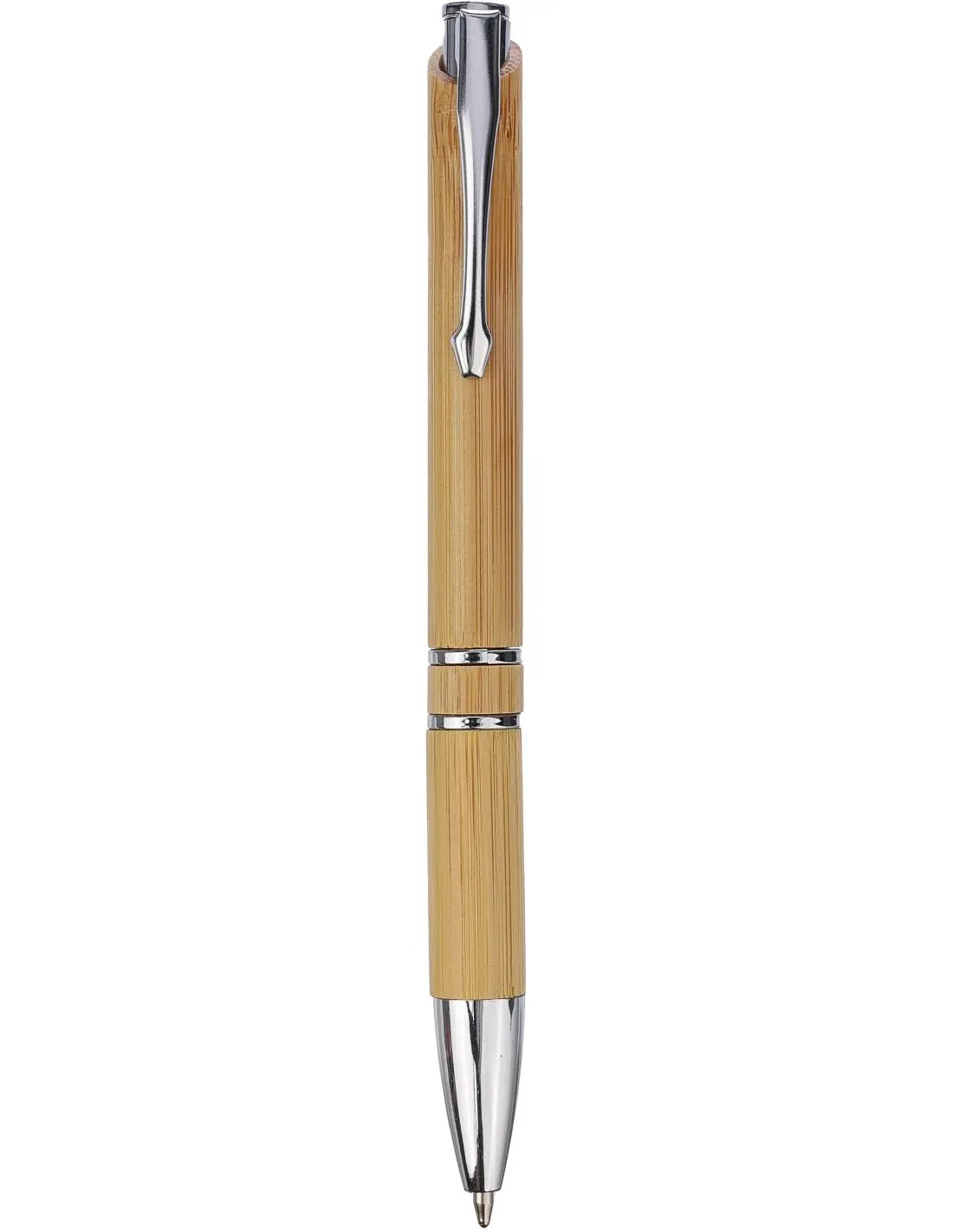 Bolígrafo de bambú con detalles cromados. Las anillas, el pulsador y la punta son de plástico y el clip de metal. Aprox. 800 metros de longitud de escritura. Tinta negra.