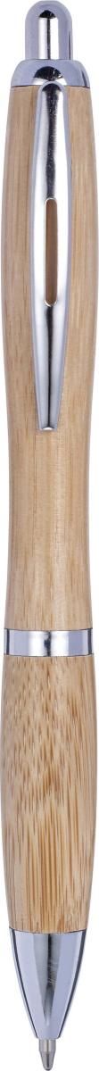 Bolígrafo de bambú con punta, pulsador, clip y aro en color plata. Tinta negra.