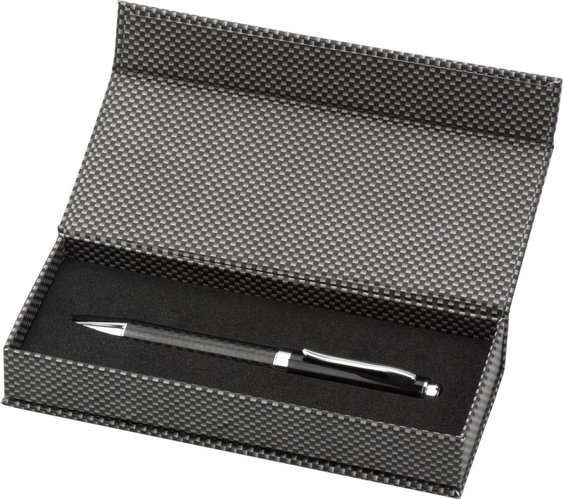 Bolígrafo de metal y fibra de carbono con mecanismo de giro. Presentado en un estuche de regalo de cartón con cierre imantado.