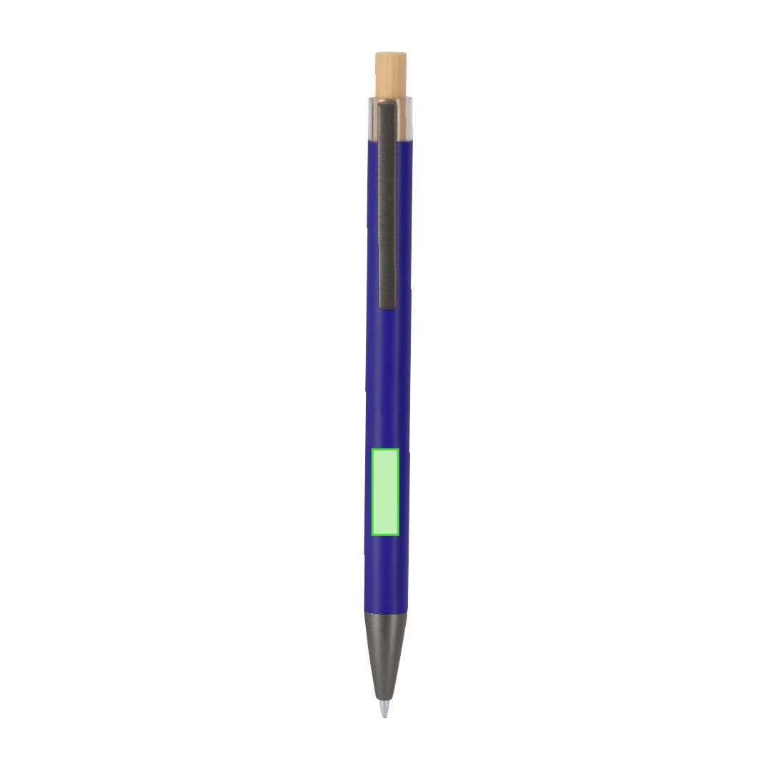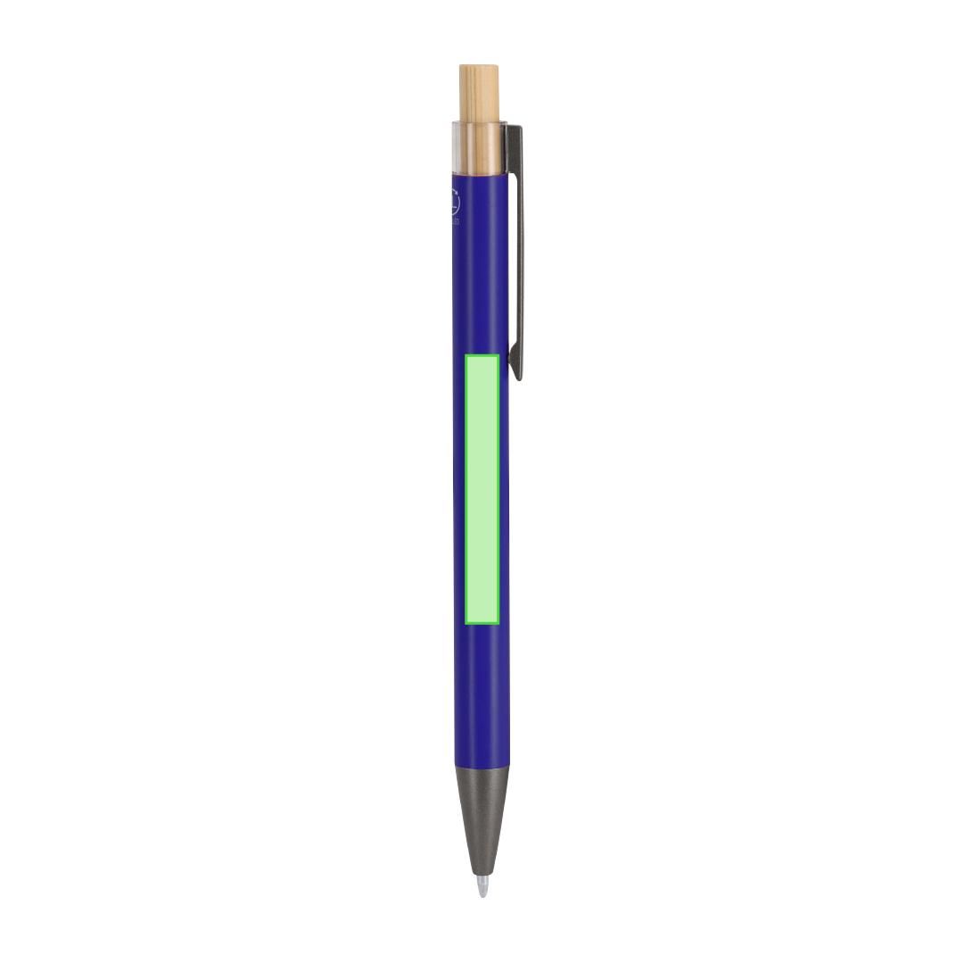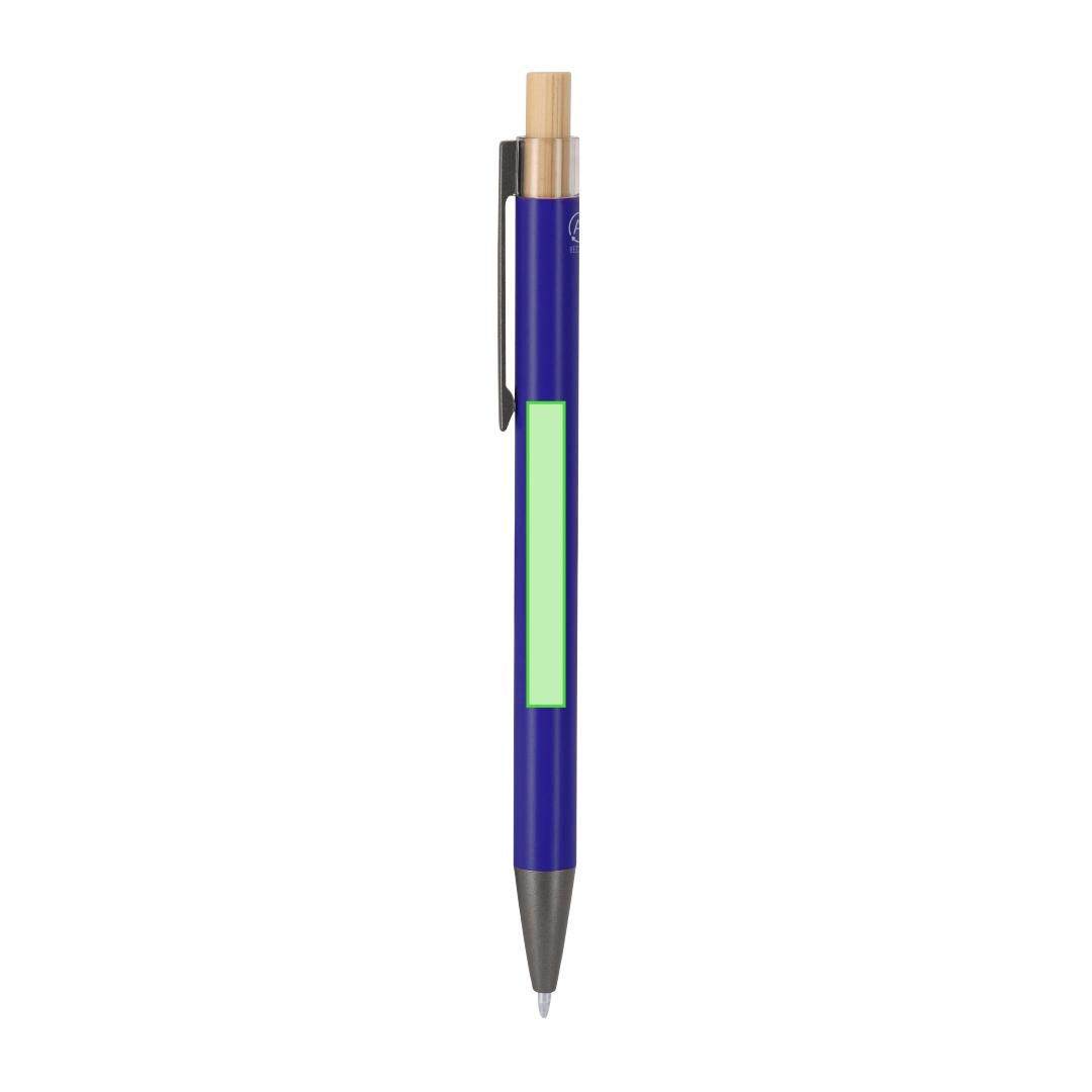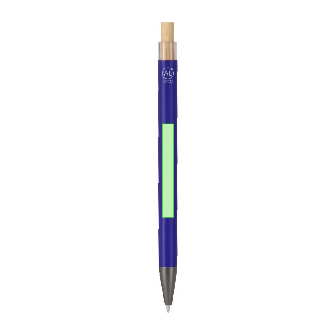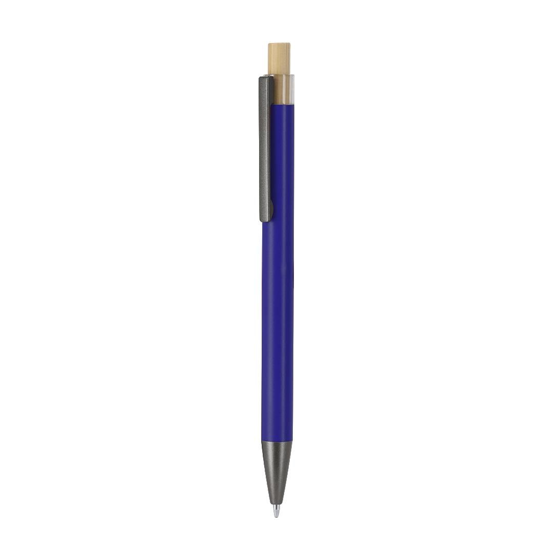Bolígrafo de mecanismo pulsador fabricado en Aluminio reciclado. Pulsador en bambú y cuerpo gris acabado mate. Clip y punta en negro. De carga jumbo y en tinta azul.