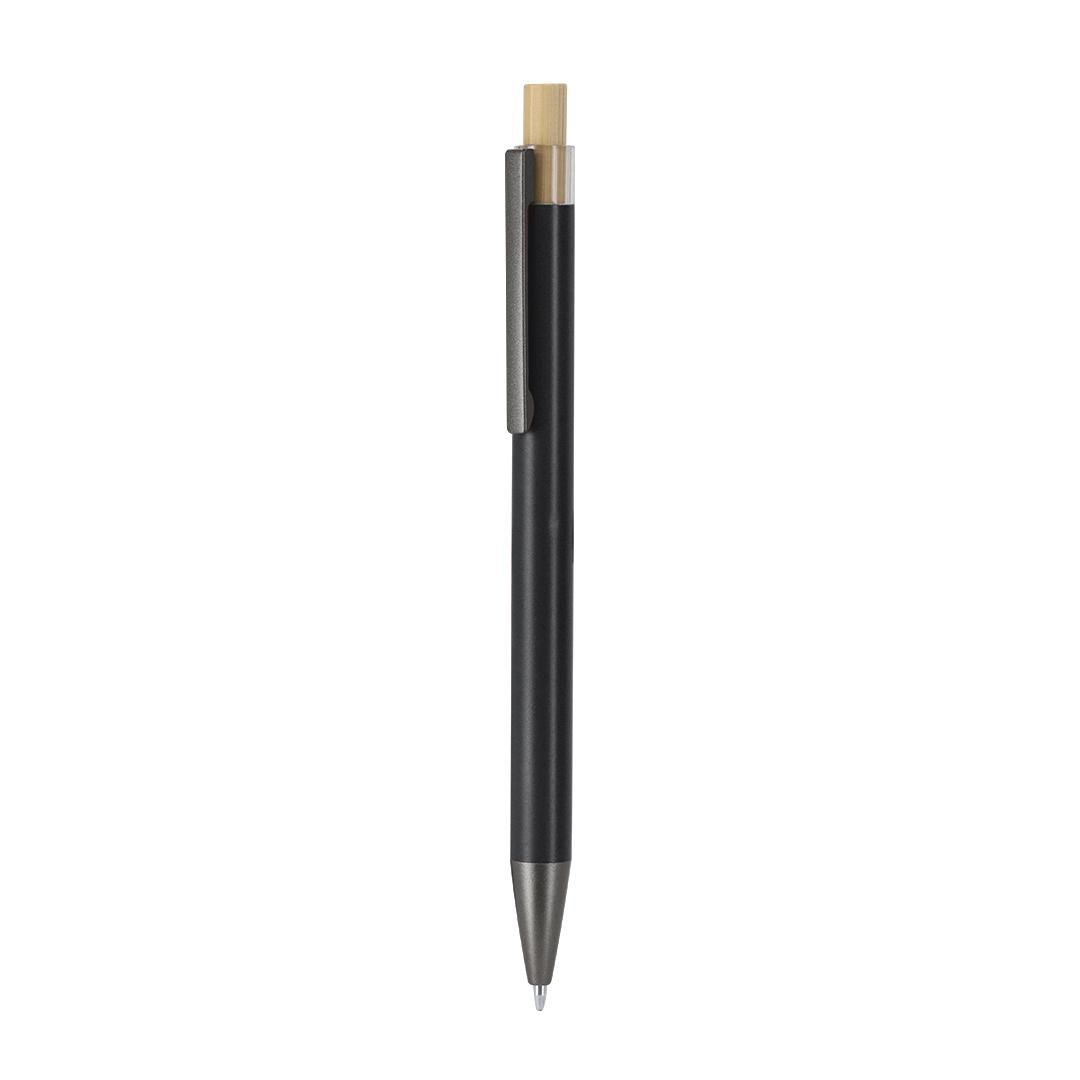 Bolígrafo de mecanismo pulsador fabricado en Aluminio reciclado. Pulsador en bambú y cuerpo gris acabado mate. Clip y punta en negro. De carga jumbo...