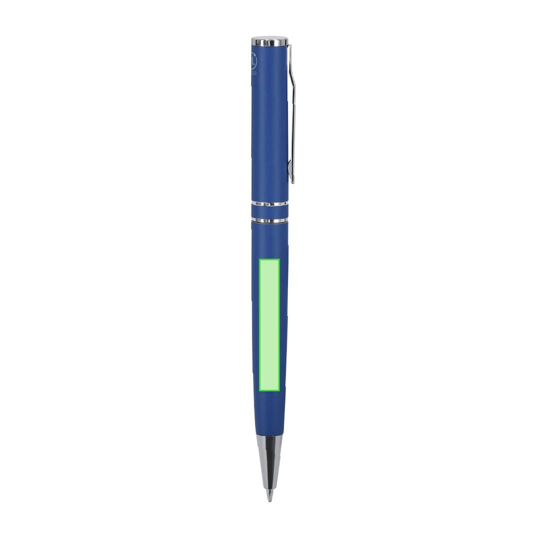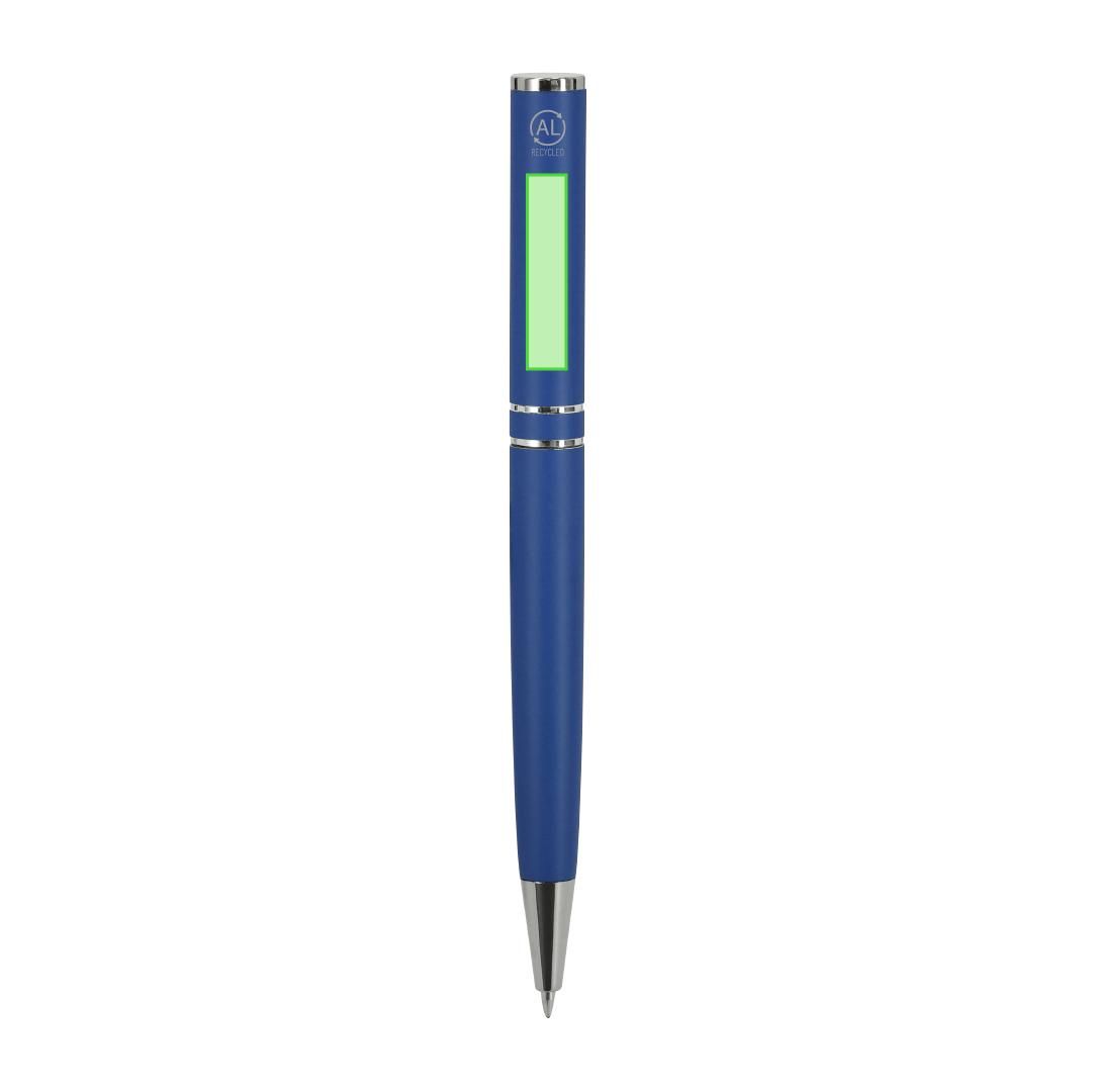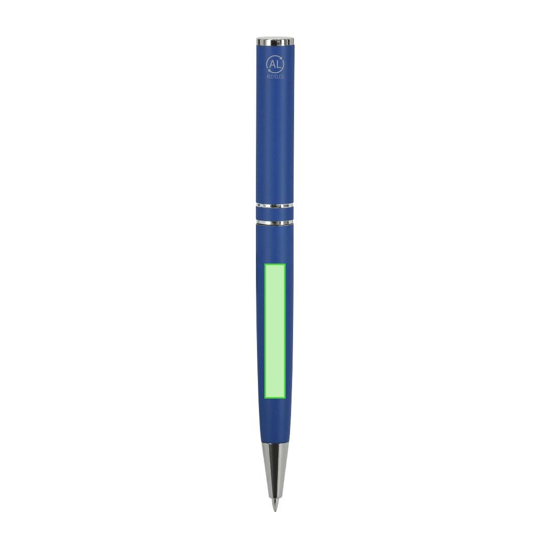 Bolígrafo con mecanismo de giro, fabricado en Aluminio Reciclado. Cuerpo con acabado mate. Incluye accesorios cromados y clip a juego. Carga jumbo y tinta azul. . Incluye distintivo Aluminio reciclado.
