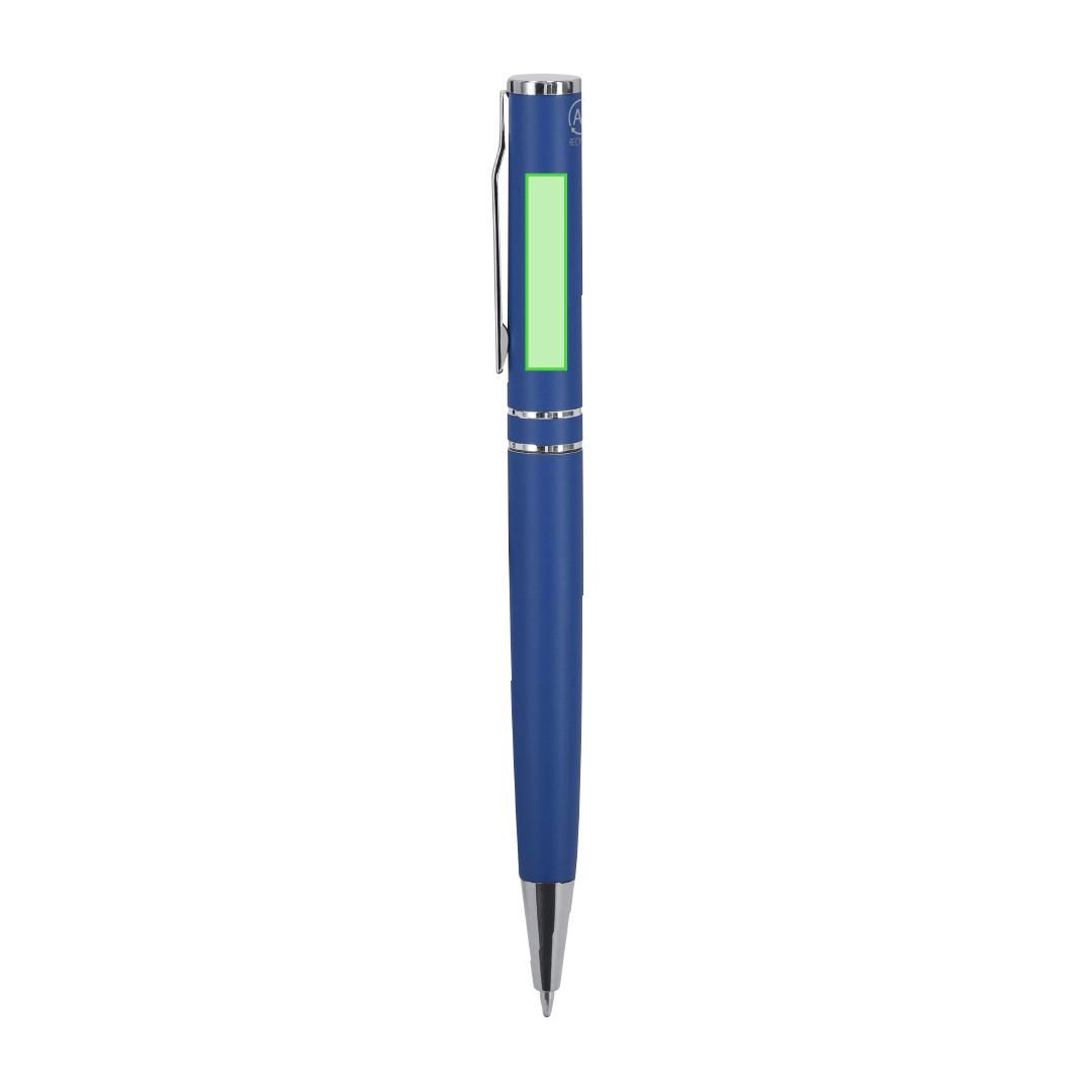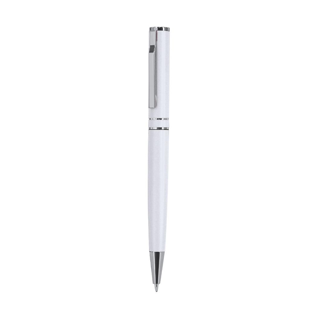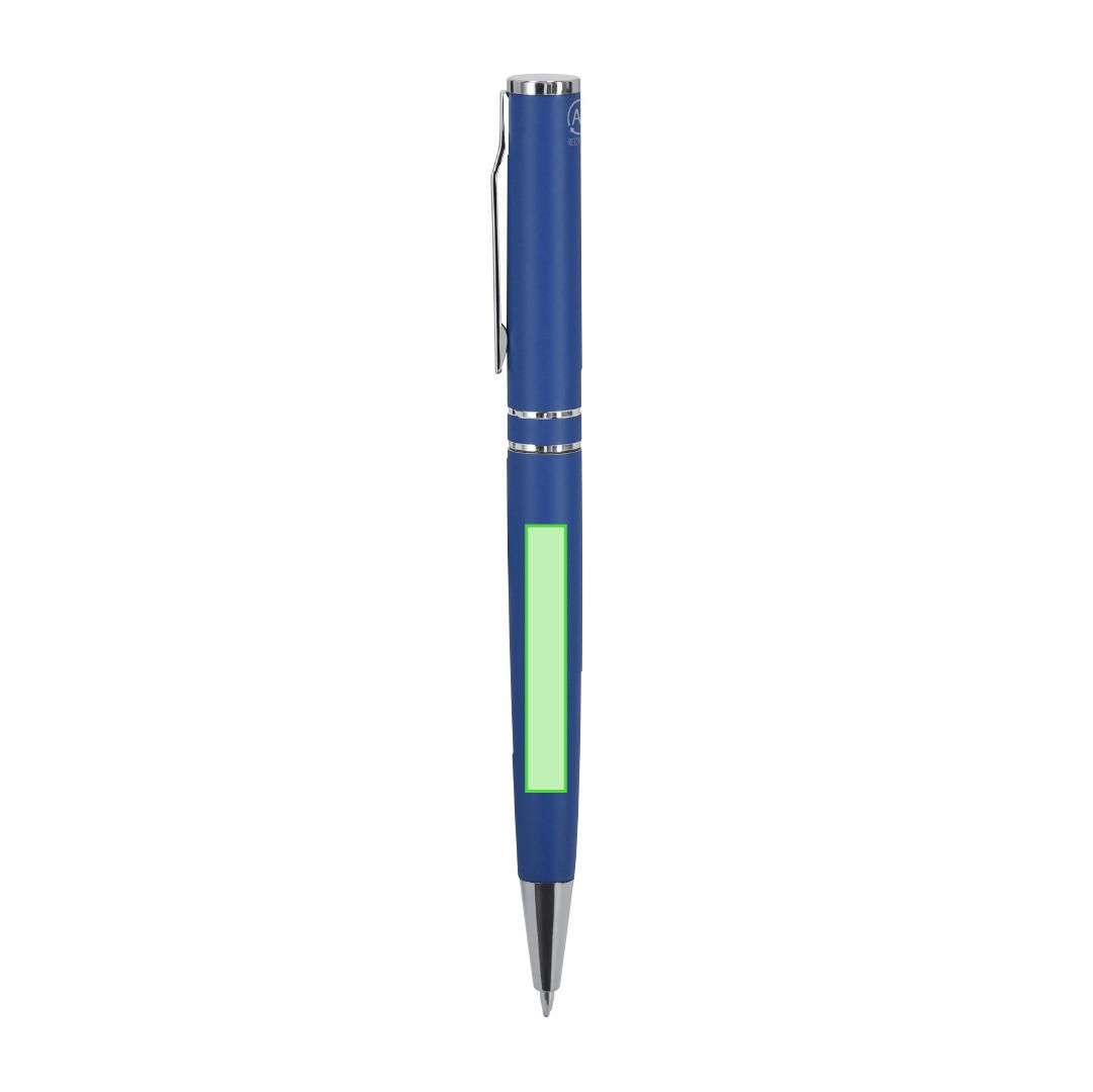 Bolígrafo con mecanismo de giro, fabricado en Aluminio Reciclado. Cuerpo con acabado mate. Incluye accesorios cromados y clip a juego. Carga jumbo y tinta azul. . Incluye distintivo Aluminio reciclado.