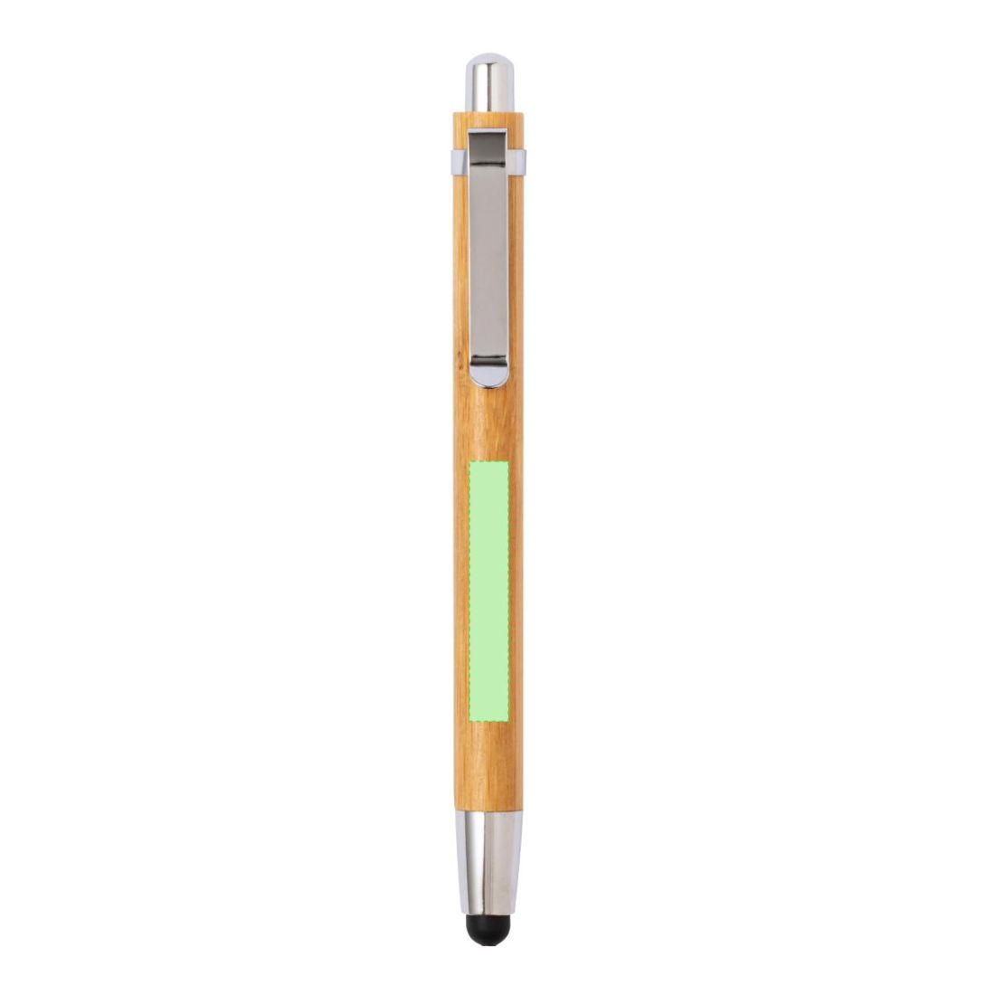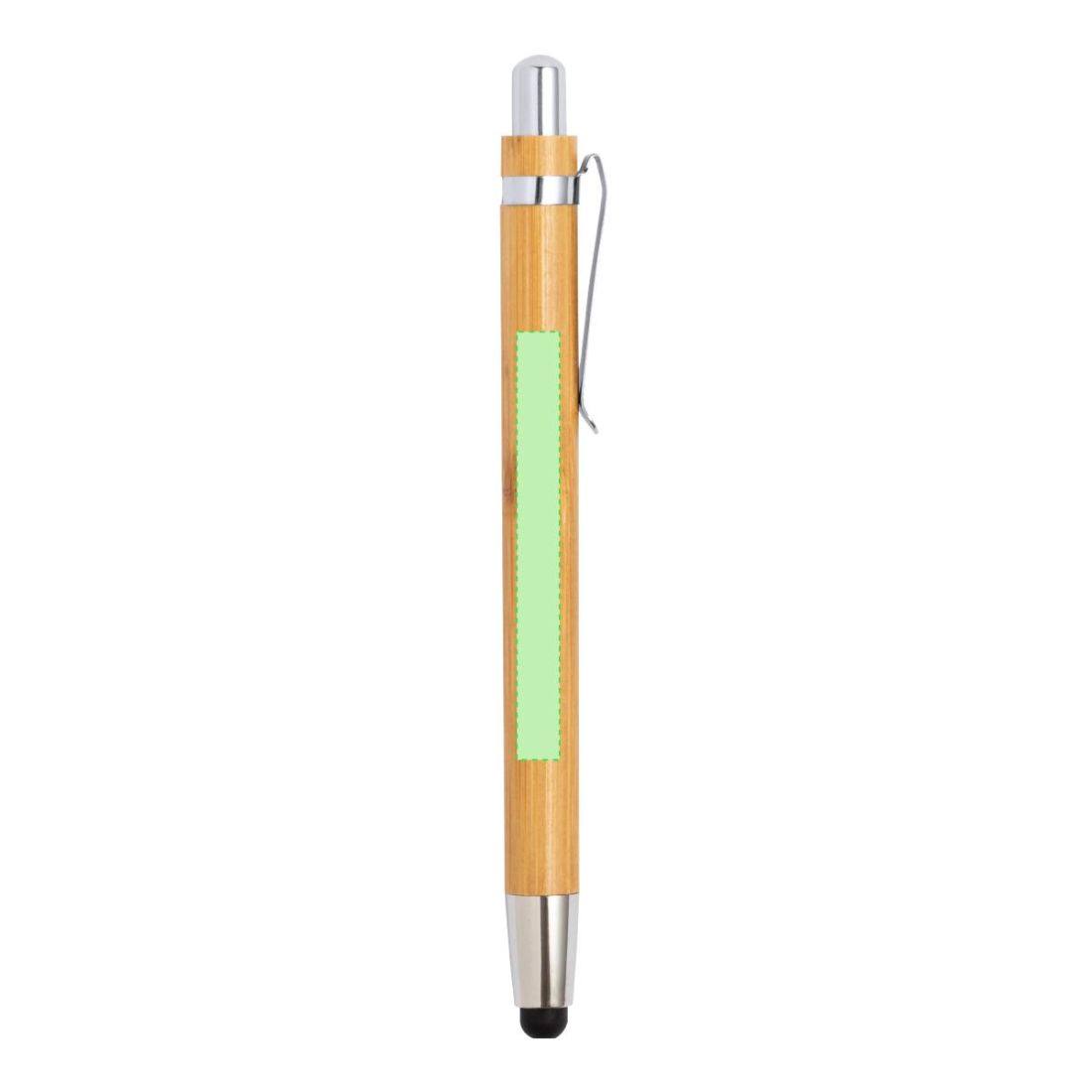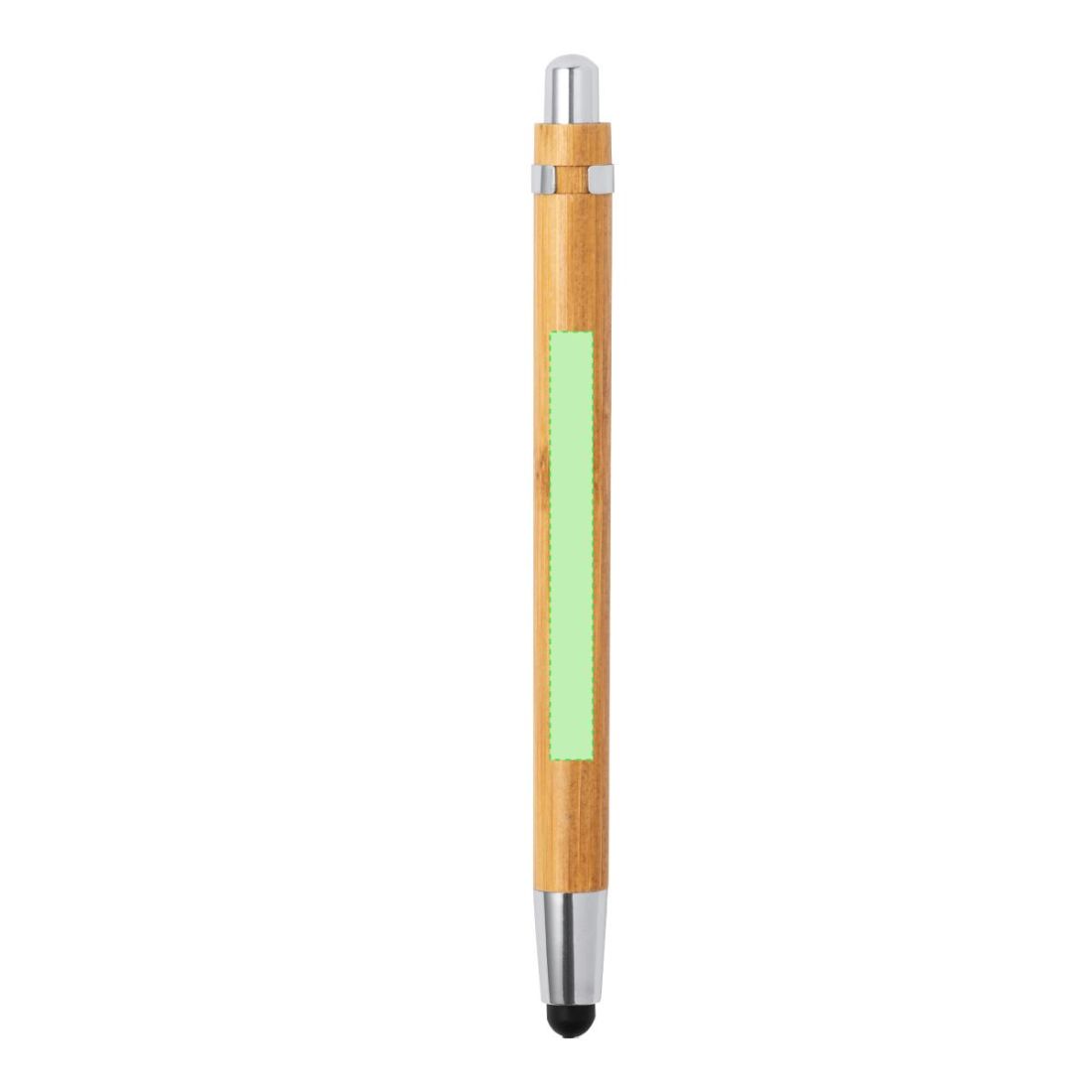 Elegante bolígrafo puntero de mecanismo pulsador con cuerpo en madera de bambú natural y accesorios de acabado metálico en color plateado brillante. De cartucho jumbo y tinta azul.