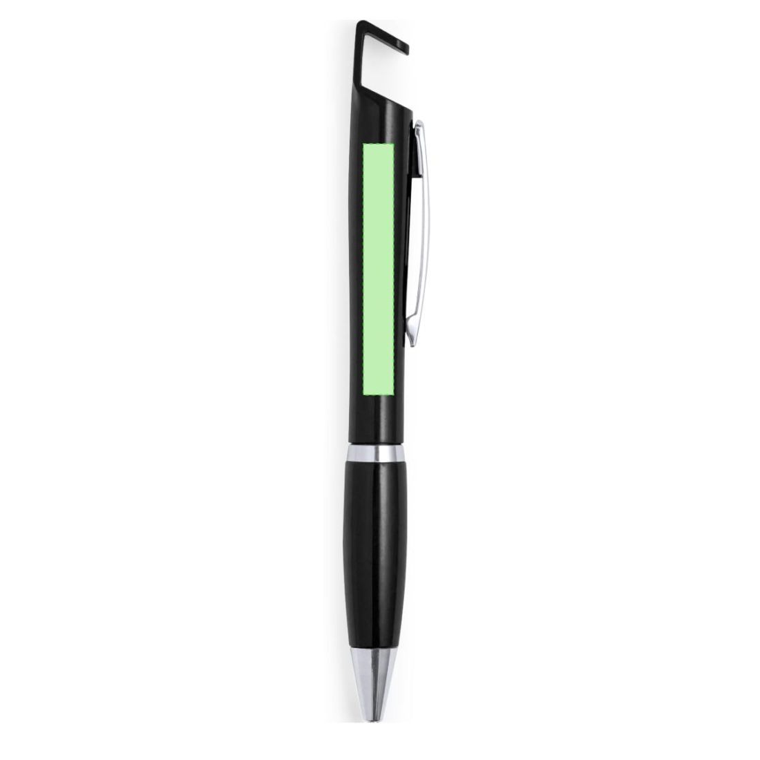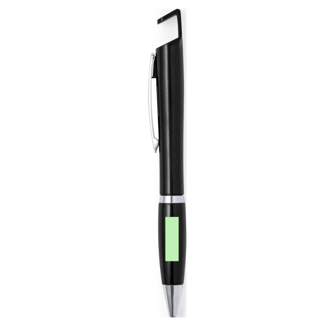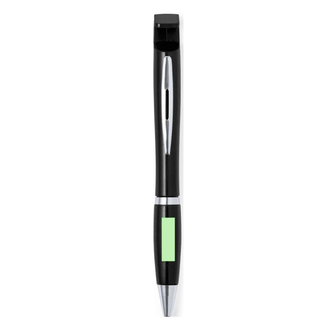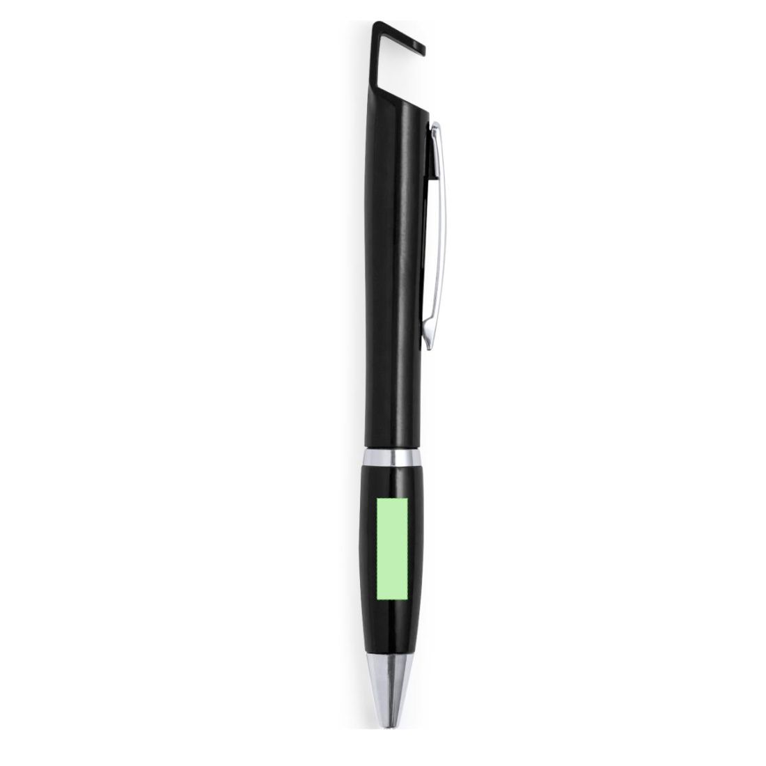 Bolígrafo con soporte para dispositivo móvil. De mecanismo pulsador y atrevido diseño bicolor con accesorios en color plateado y cuerpo de suave acabado en divertidos colores sólidos. Con original clip metálico troquelado a juego y cómoda empuñadura. Tinta azul.