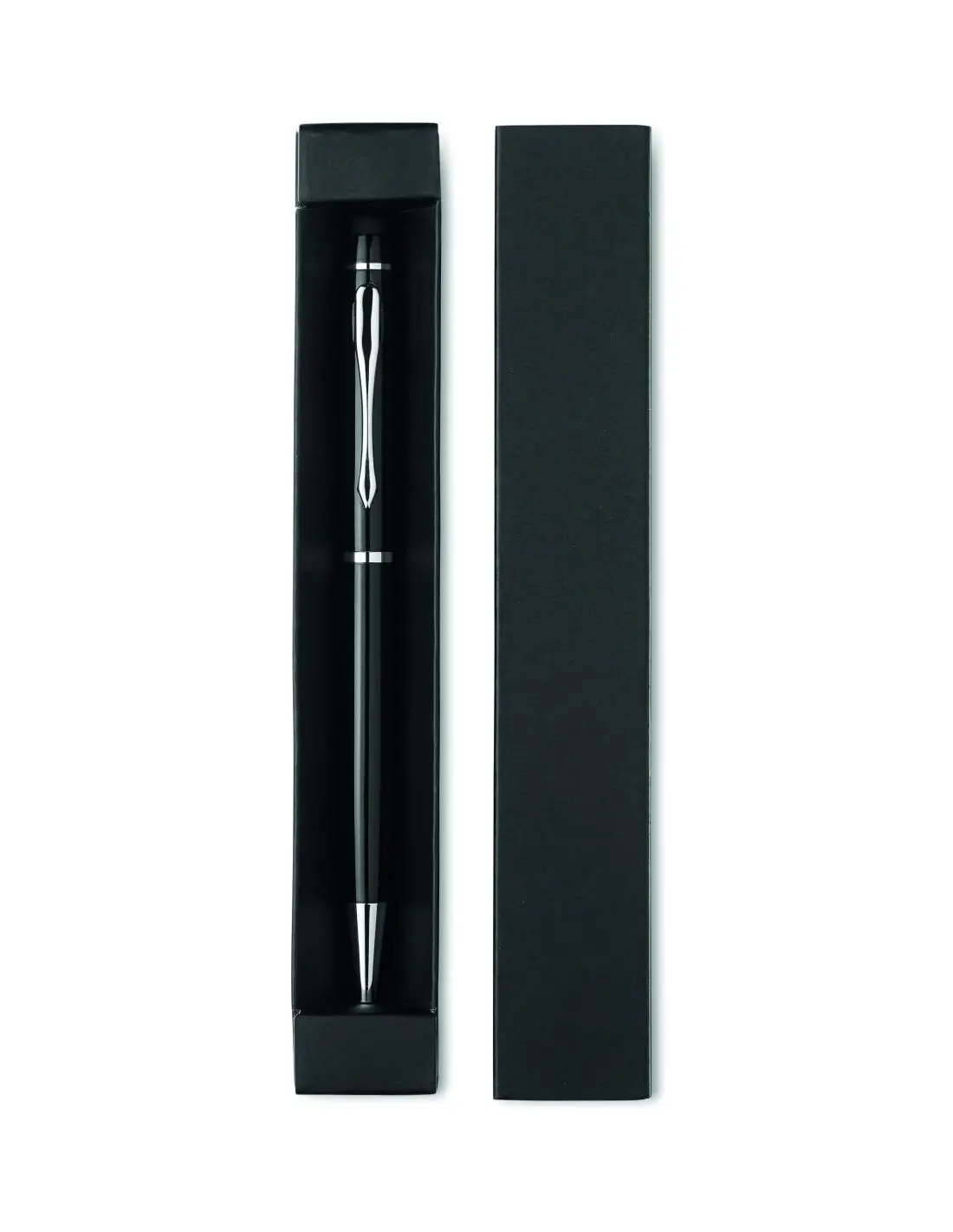 Bolígrafo giratorio de aluminio y con puntero para pantallas táctiles. Tinta azul. Presentado en estuche de cartón.