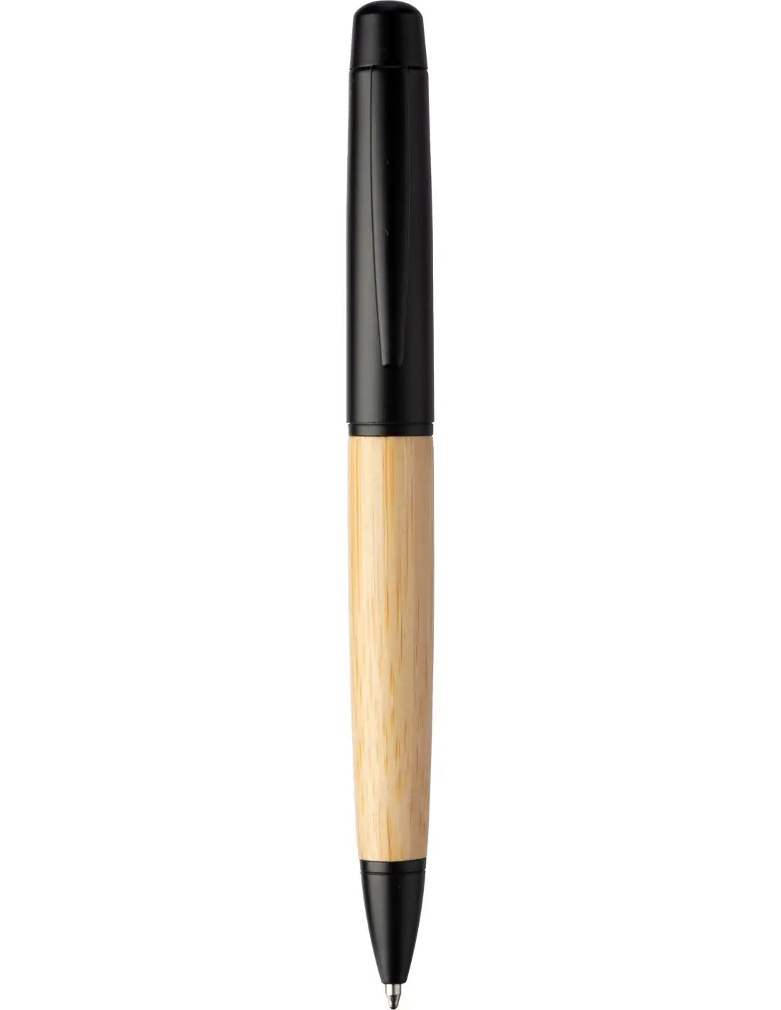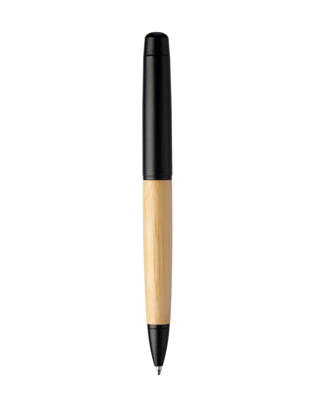 Bolígrafo con mecanismo de giro, de acero inoxidable y empuñadura de bambú, en un tubo de aluminio y bambú. Incluye recarga azul metálica. Presentado en una caja de cartón marrón.