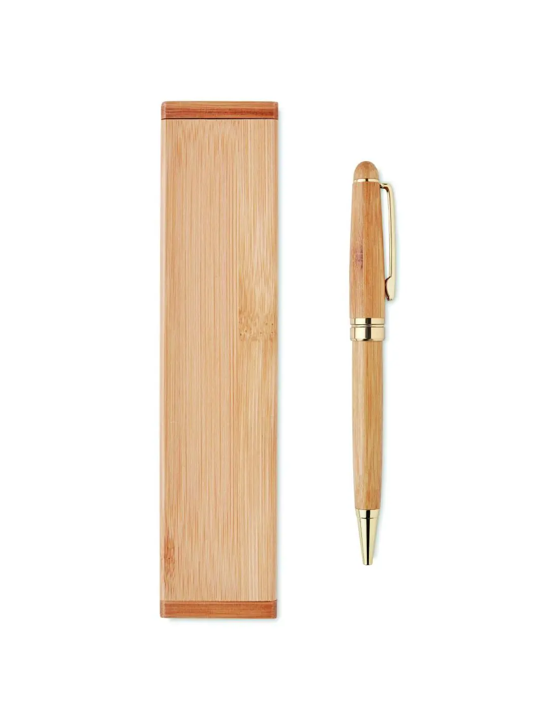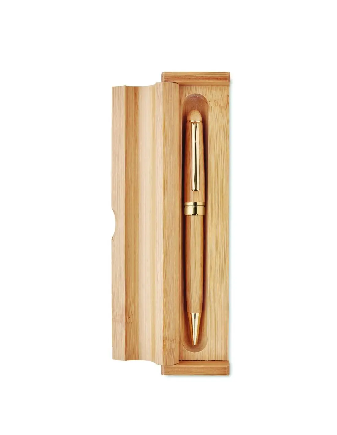 Bolígrafo giratorio de bambú presentado en estuche de bambú. Tinta azul. El bambú es un producto natural, puede haber ligeras variaciones en el color y el tamaño por artículo, lo que puede afectar el resultado final de la impresión.